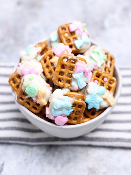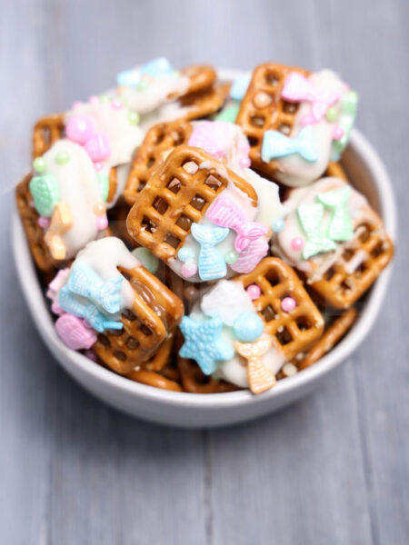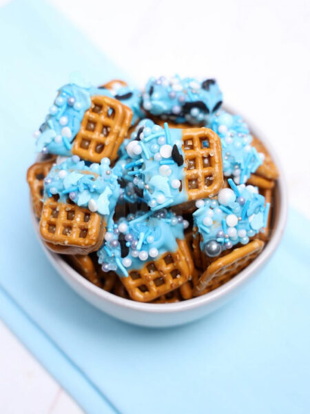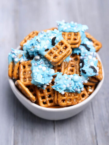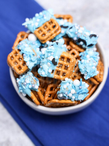 Sealife Caramel Pretzels is made with sealife sprinkles, blue candy melts, sea salt caramel, and snaps pretzels. This is a semi exclusive recipe. The Sealife Caramel Pretzels comes in a white bowl with gray wood backdrop. Set comes with 12 in process (in process are the same for all sets) and 15 final shots (finals are different for each set) along with recipe in text format. Both vertical and horizontal shots are available for social media. One set of four. Sample removed on finals.