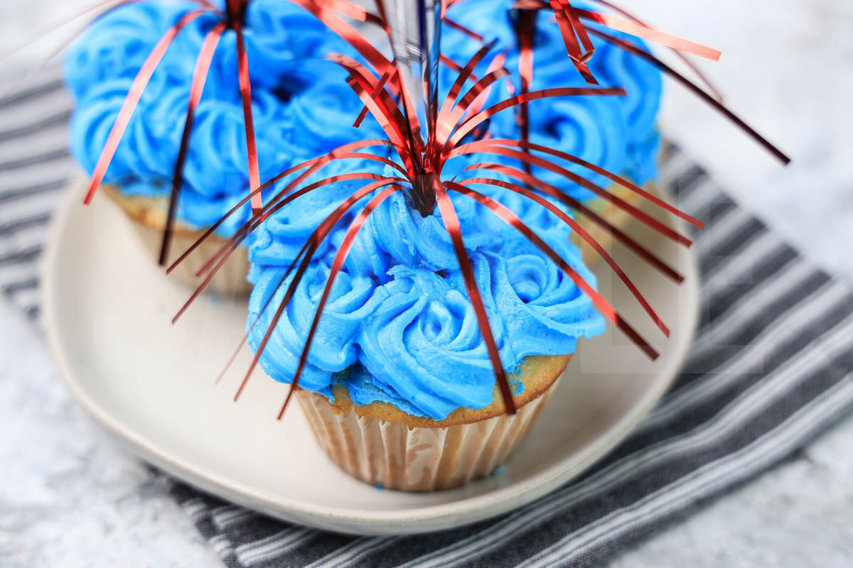 4th Of July Sparkler Cupcakes is made with powdered sugar, flour, and eggs. This is a semi exclusive recipe. The 4th Of July Sparkler Cupcakes comes on a gray striped napkin on a marble backdrop. Set comes with 6 in process (in process are the same for all sets) and 14 final shots (finals are different for each set) along with recipe in text format. Both vertical and horizontal shots are available for social media. One set of four. Sample removed on finals.