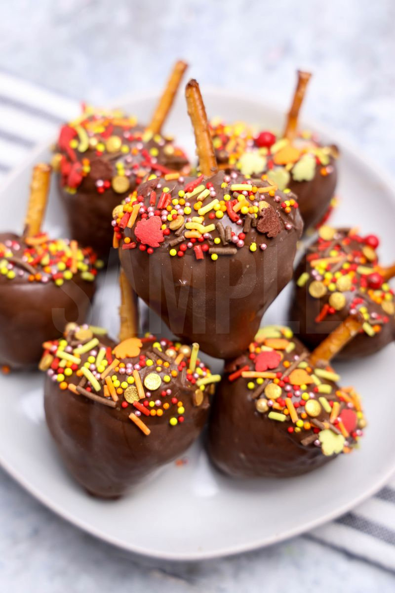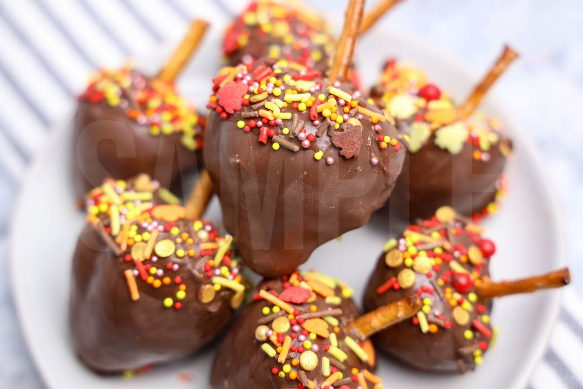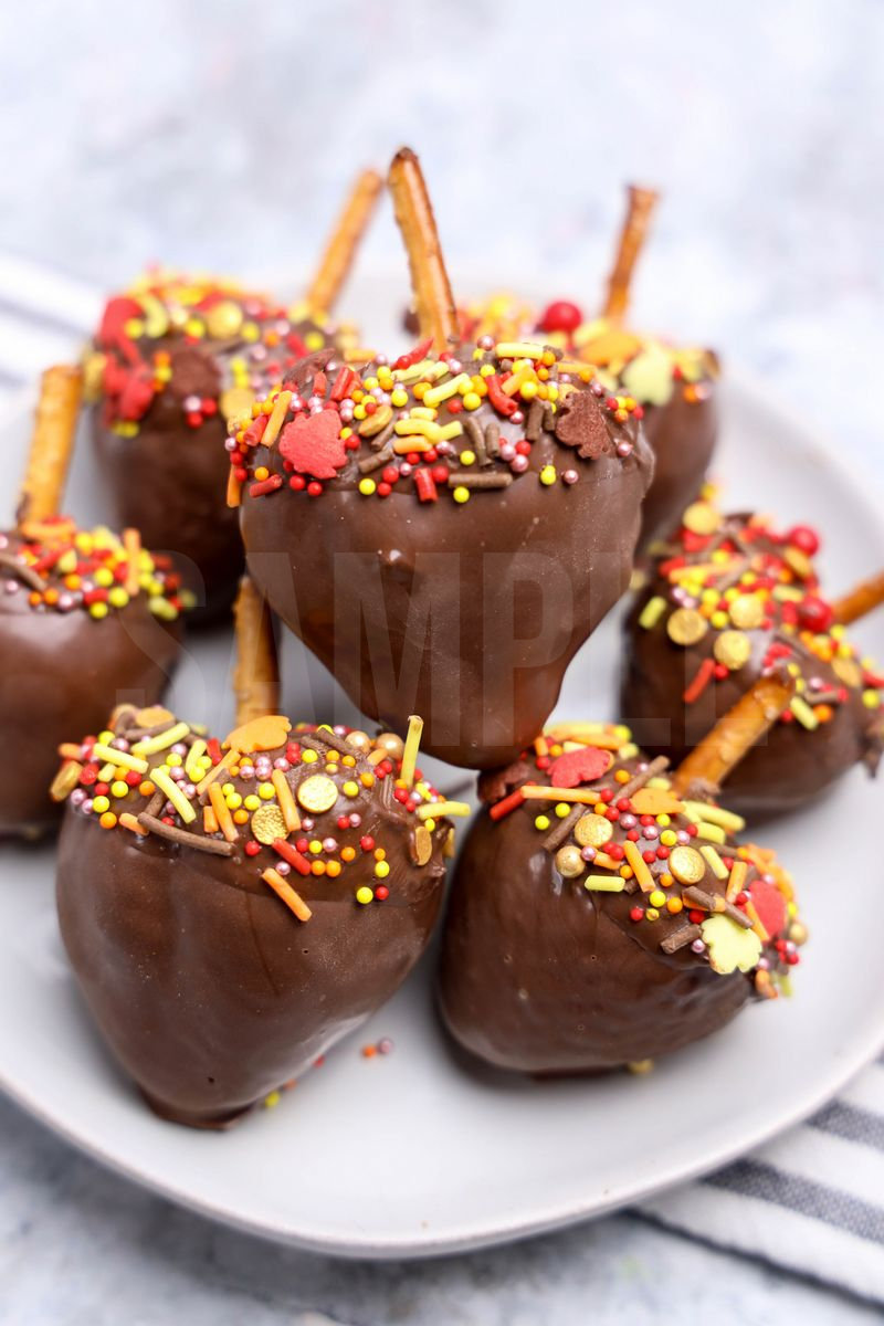 Acorn Strawberries is made with pretzels, strawberries, Ghirardelli’s chocolate, and fall sprinkles. This is a semi exclusive recipe. The Acorn Strawberries comes on a white plate with a marble wood backdrop. Set comes with 9 in process (in process are the same for all sets) and 16 final shots (finals are different for each set) along with recipe in text format. Both vertical and horizontal shots are available for social media. One set of four. Sample removed on finals.