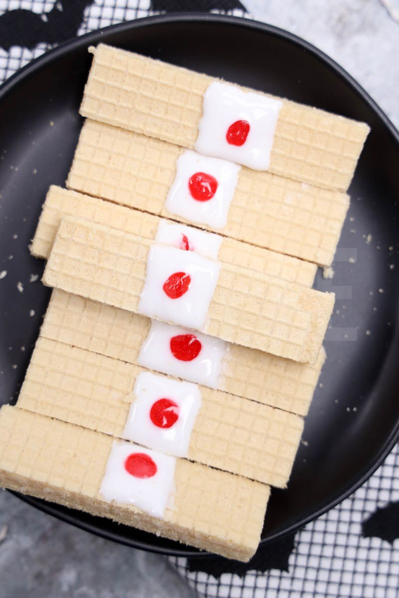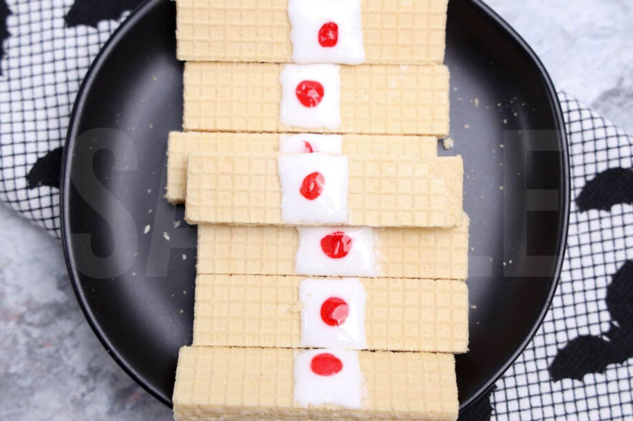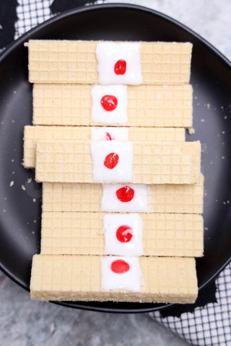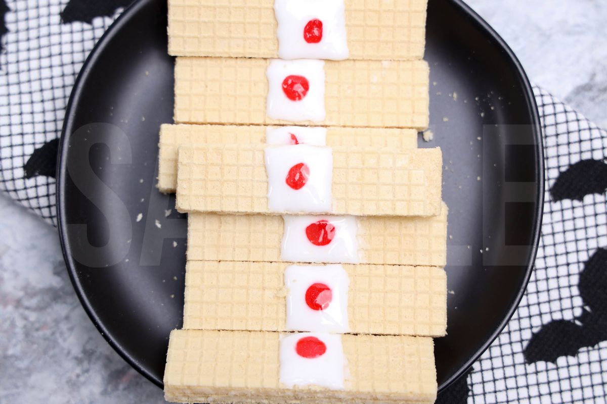 Bandaid Wafers is made with wafers, cookie icing, and red sparkle gel. This is a semi exclusive recipe. The Bandaid Wafers comes on a black plate with a marble wood backdrop. Set comes with 7 in process (in process are the same for all sets) and 15 final shots (finals are different for each set) along with recipe in text format. Both vertical and horizontal shots are available for social media. One set of four. Sample removed on finals.