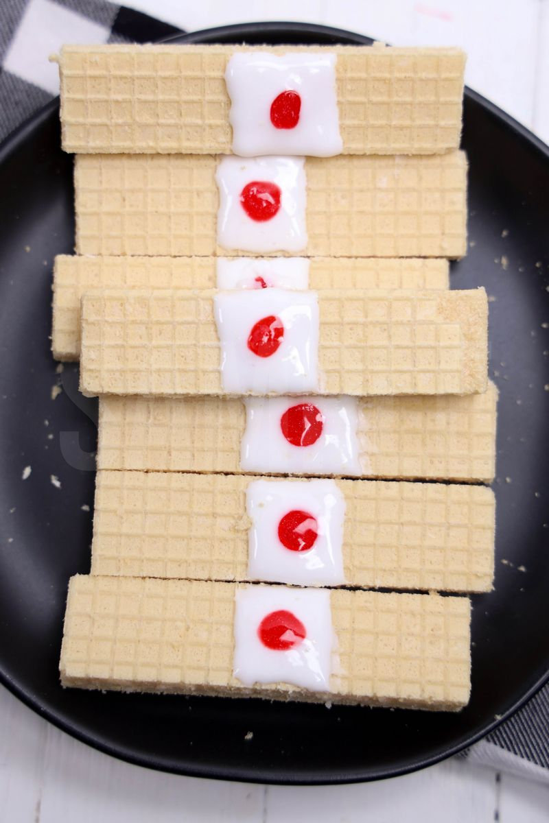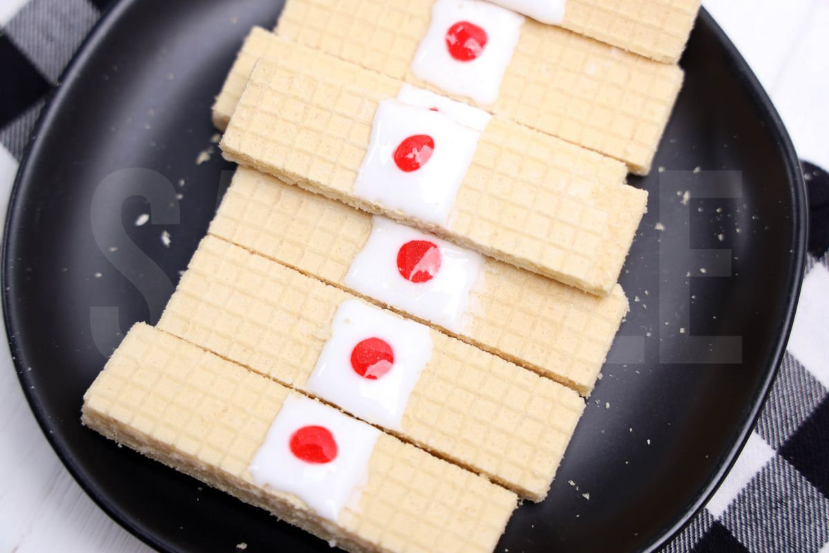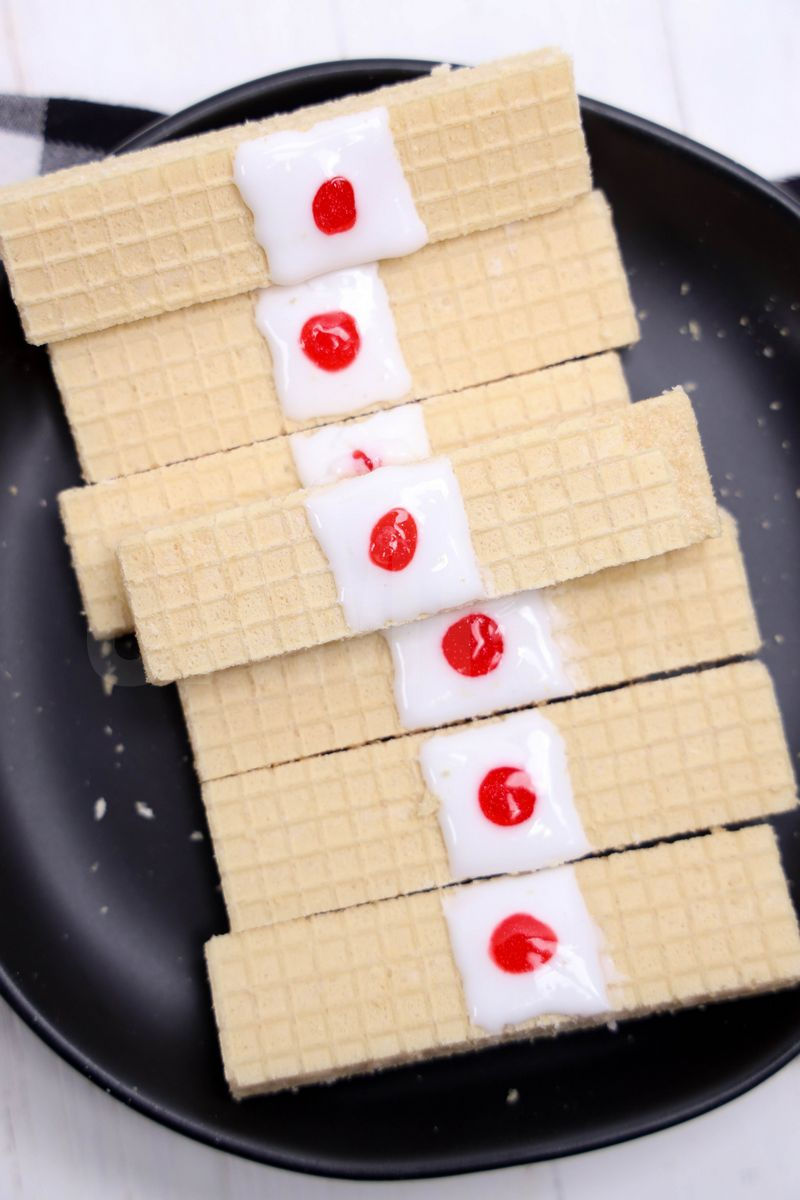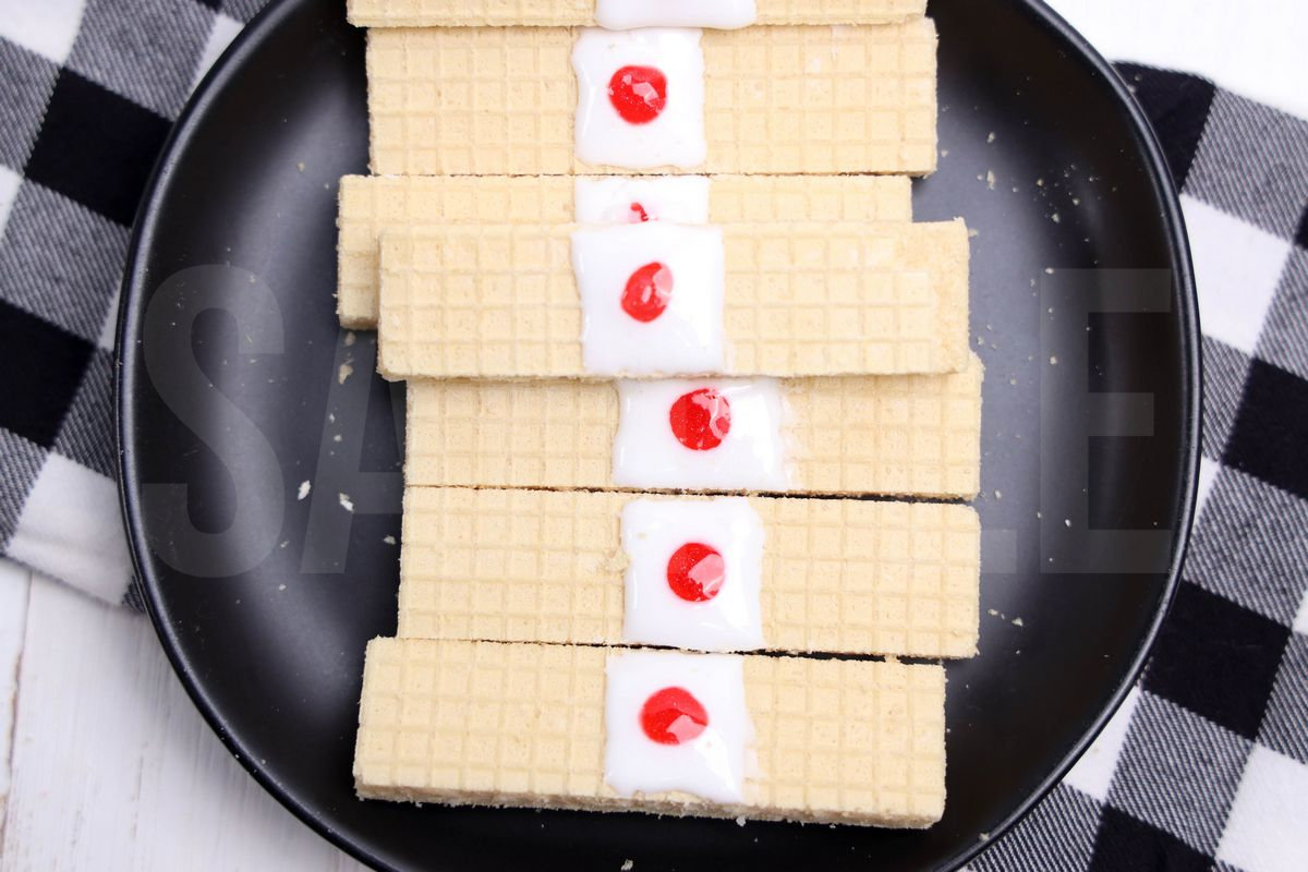 Bandaid Wafers is made with wafers, cookie icing, and red sparkle gel. This is a semi exclusive recipe. The Bandaid Wafers comes on a black plate with a white wood backdrop. Set comes with 7 in process (in process are the same for all sets) and 15 final shots (finals are different for each set) along with recipe in text format. Both vertical and horizontal shots are available for social media. One set of four. Sample removed on finals.