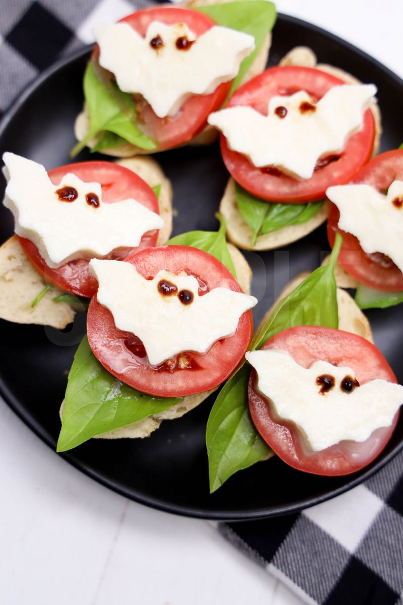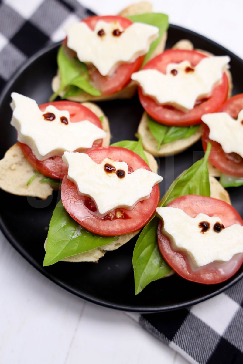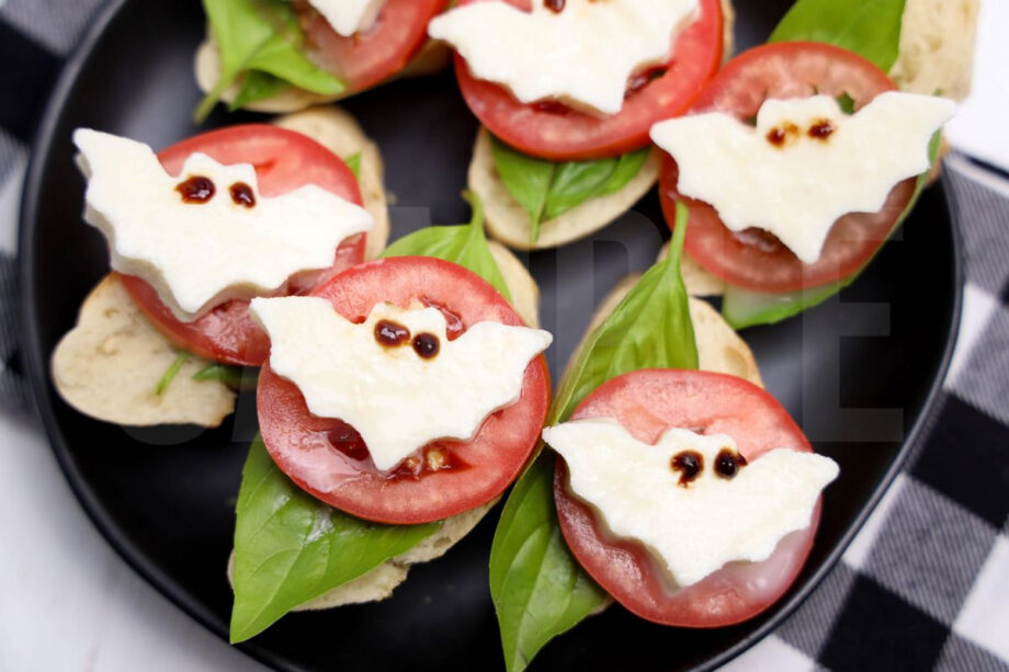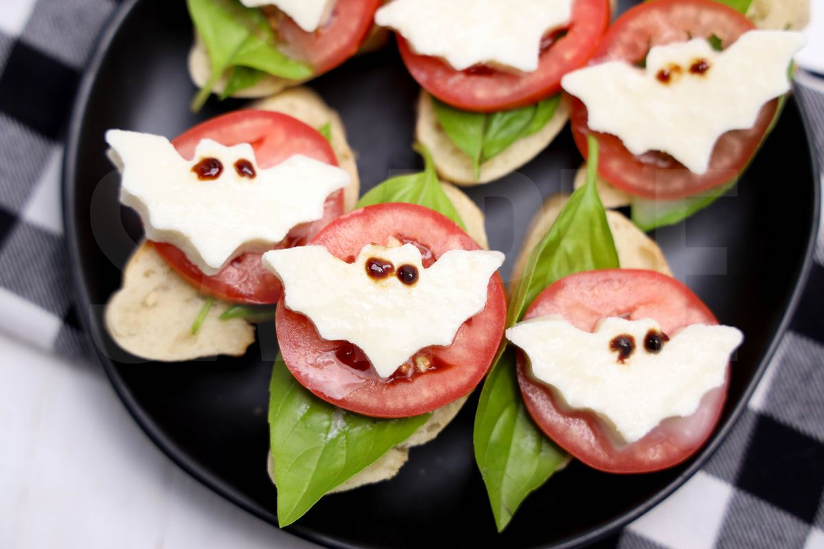 Bat Caprese Crostini is made with bread, basil, tomato, and fresh mozzarella. This is a semi exclusive recipe. The Bat Caprese Crostini comes on a black plate with a white wood backdrop. Set comes with 13 in process (in process are the same for all sets) and 16 final shots (finals are different for each set) along with recipe in text format. Both vertical and horizontal shots are available for social media. One set of four. Sample removed on finals.