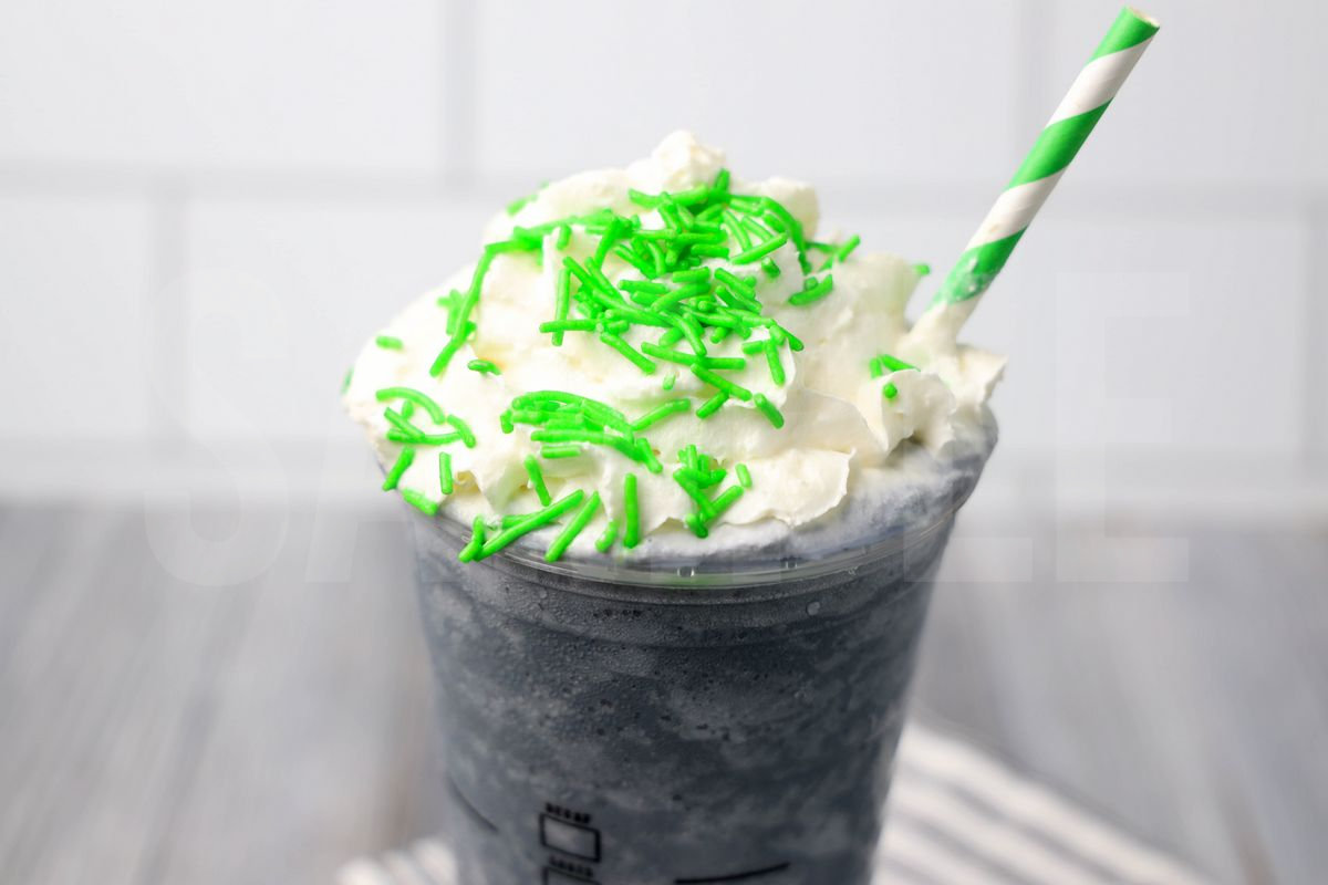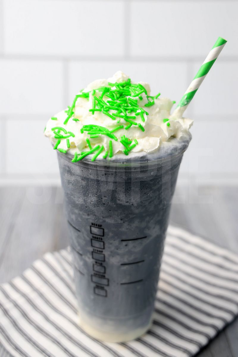 Beetlejuice Frappuccino Starbucks Copycat is made with heavy cream, ice, and vanilla simple syrup. This is a semi exclusive recipe. The Beetlejuice Frappuccino Starbucks Copycat comes in a venti cup with a white striped napkin on a gray wood backdrop. Set comes with 5 in process (in process are the same for all sets) and 15 final shots (finals are different for each set) along with recipe in text format. Both vertical and horizontal shots are available for social media. One set of four. Sample removed on finals.