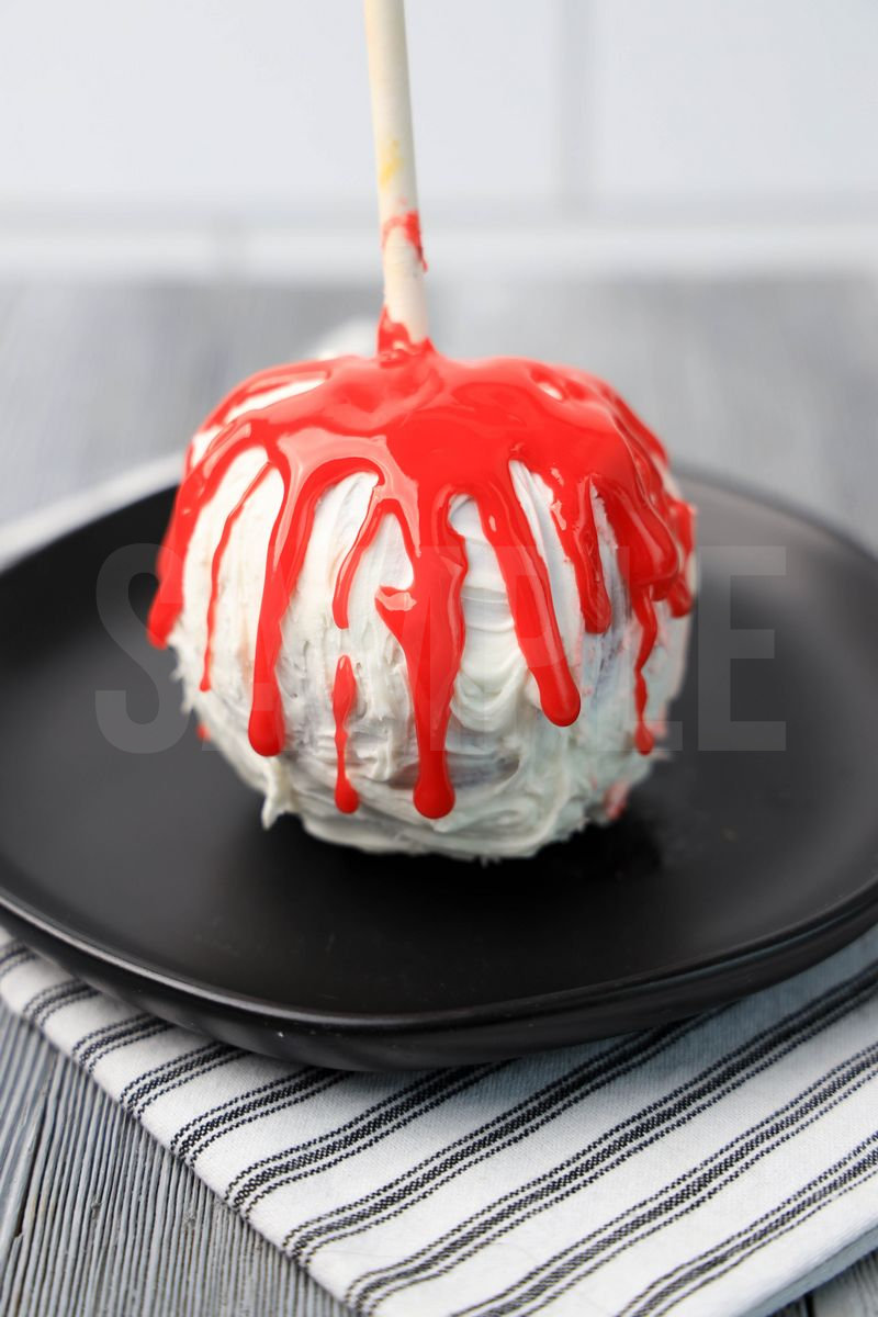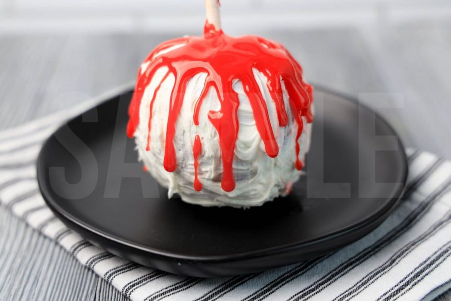 Bloody Candy Apples is made with apples, white candy melts, and red cookie icing. This is a semi exclusive recipe. The Bloody Candy Apples comes on a black plate with a white striped napkin on a gray wood backdrop. Set comes with 5 in process (in process are the same for all sets) and 18 final shots (finals are different for each set) along with recipe in text format. Both vertical and horizontal shots are available for social media. One set of four. Sample removed on finals.