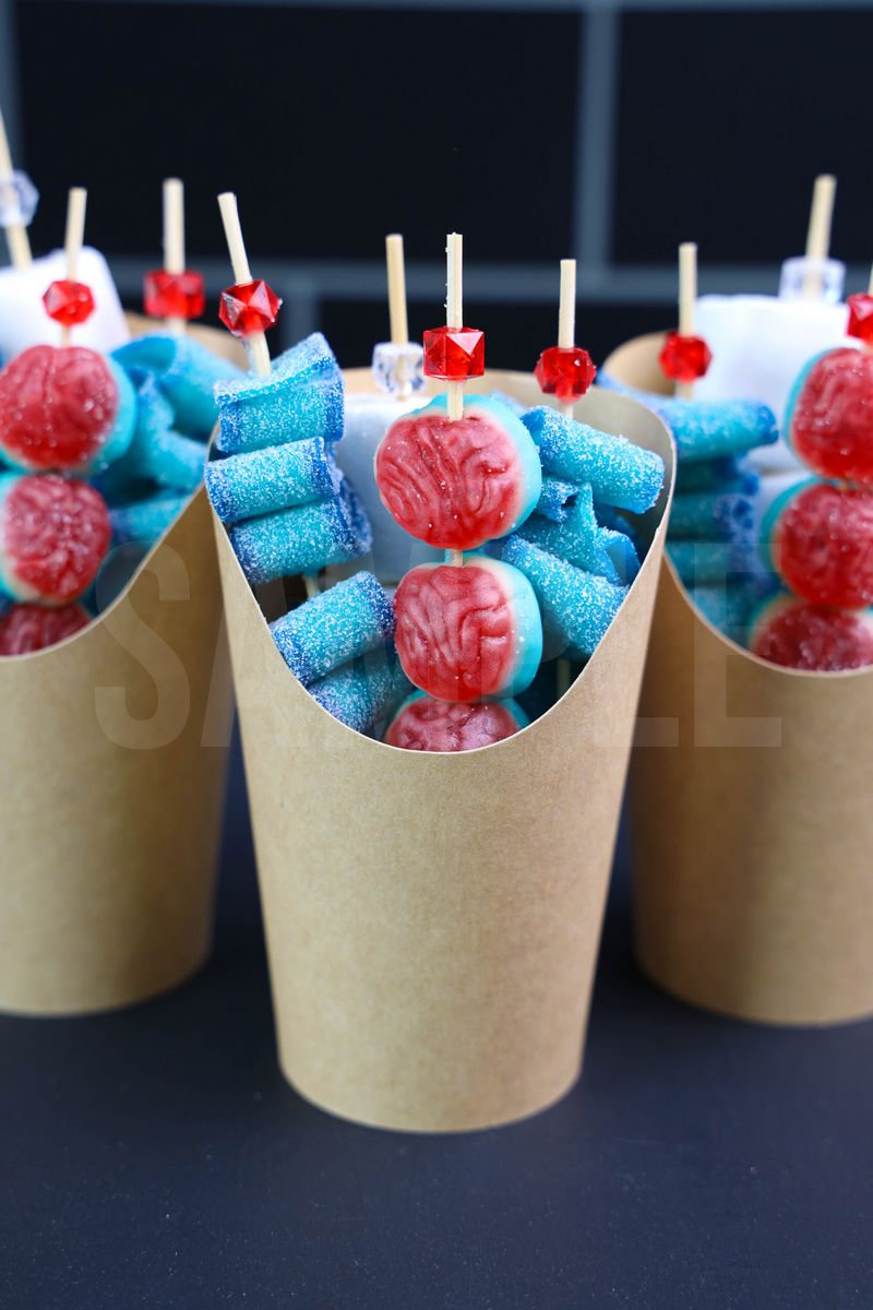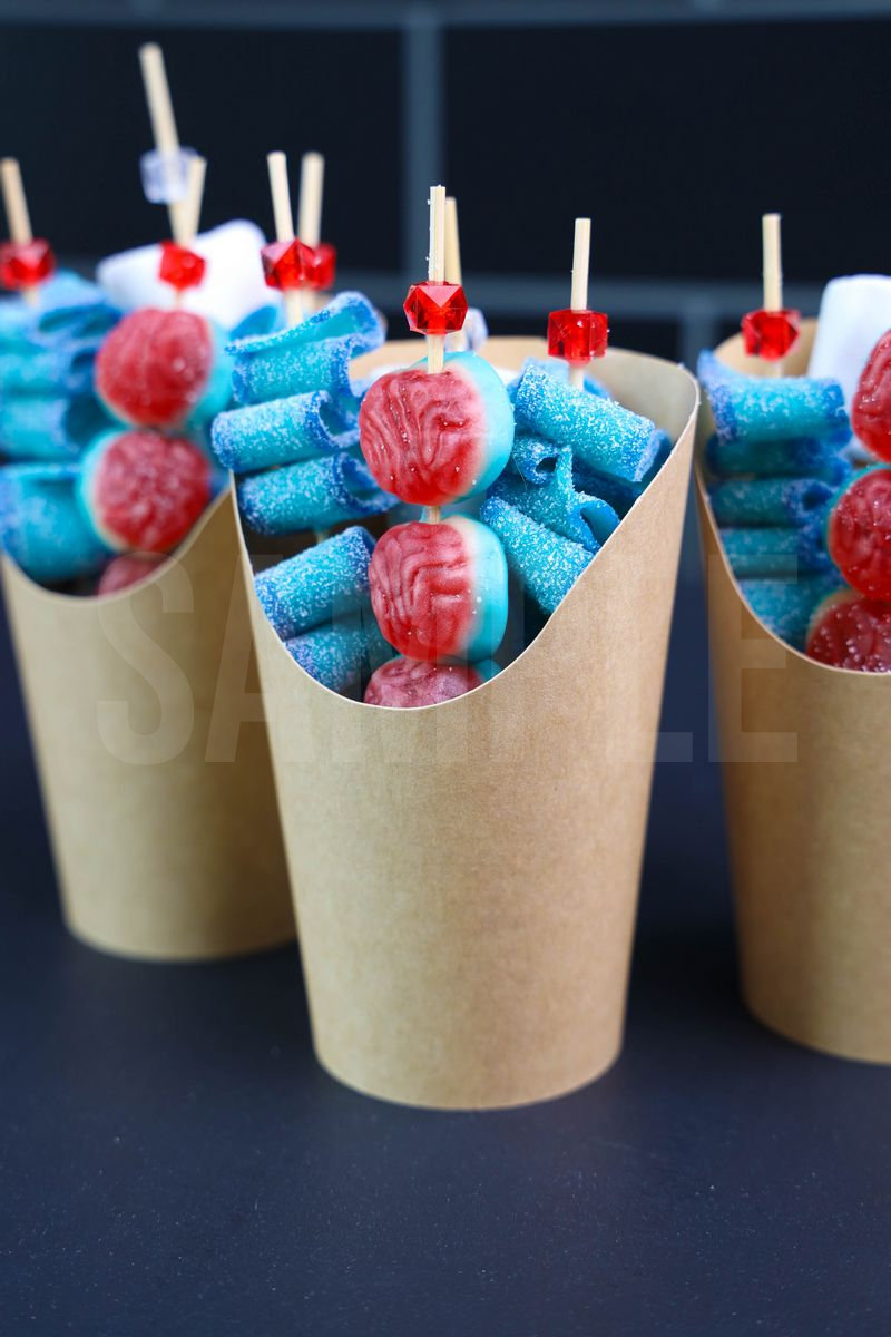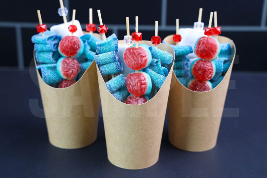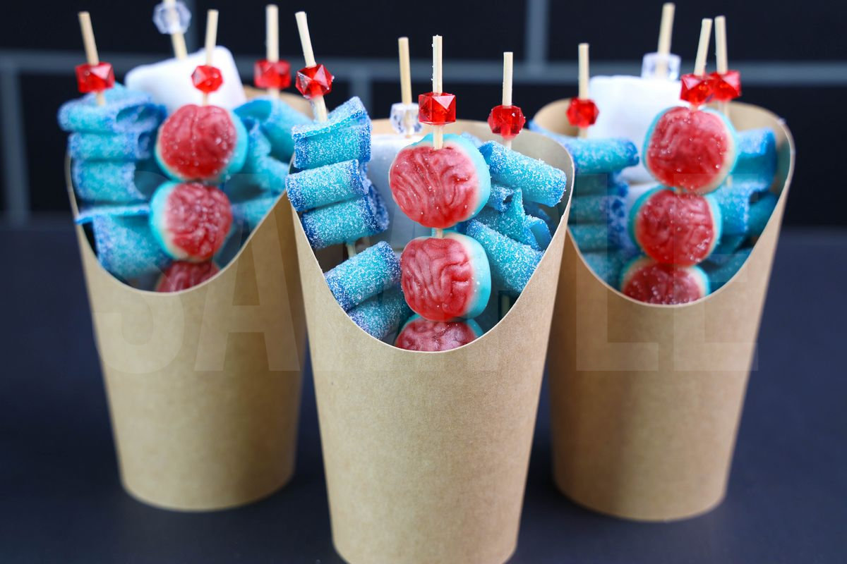 Brain Candy Cups is made with sour strips, marshmallows, and brain gummies. This is a semi exclusive recipe. The Brain Candy Cups comes in a brown fry cup with black wood backdrop. Set comes with 9 in process (in process are the same for all sets) and 18 final shots (finals are different for each set) along with recipe in text format. Both vertical and horizontal shots are available for social media. One set of four. Sample removed on finals.