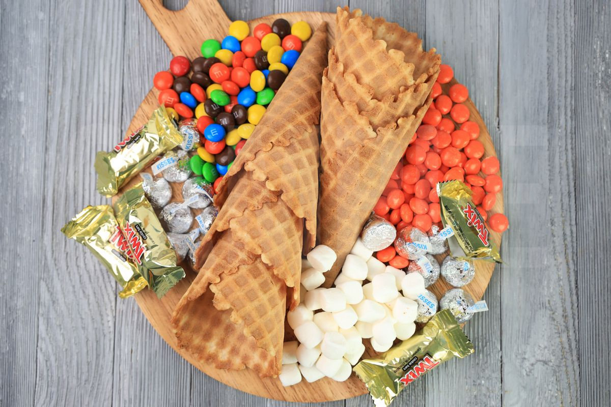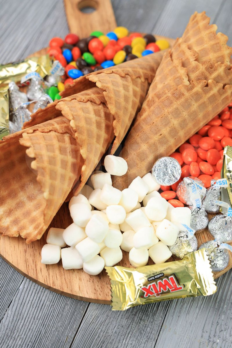 Campfire Cone Charcuterie Board is made with waffle cones, M&M’s, and Reese’s Pieces. This is a semi exclusive recipe. The Campfire Cone Charcuterie Board comes on a gray wood backdrop. Set comes with 7 in process (in process are the same for all sets) and 17 final shots (finals are different for each set) along with recipe in text format. Both vertical and horizontal shots are available for social media. One set of four. Sample removed on finals.