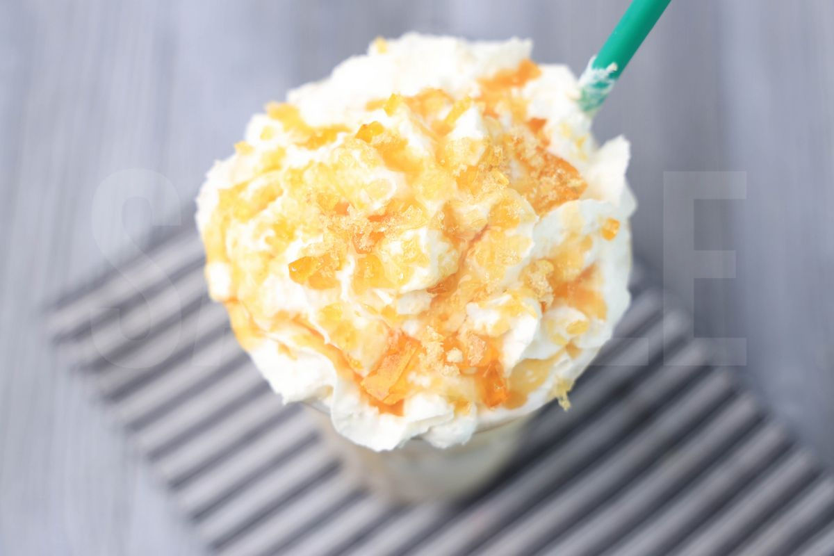 Caramel Ribbon Crunch Crème Frappuccino is made with caramel syrup, caramel crushed, and ice. This is a semi exclusive recipe. The Caramel Ribbon Crunch Crème Frappuccino comes in a venti cup with a gray striped napkin on a gray wood backdrop. Set comes with 14 in process (in process are the same for all sets) and 17 final shots (finals are different for each set) along with recipe in text format. Both vertical and horizontal shots are available for social media. One set of four. Sample removed on finals.