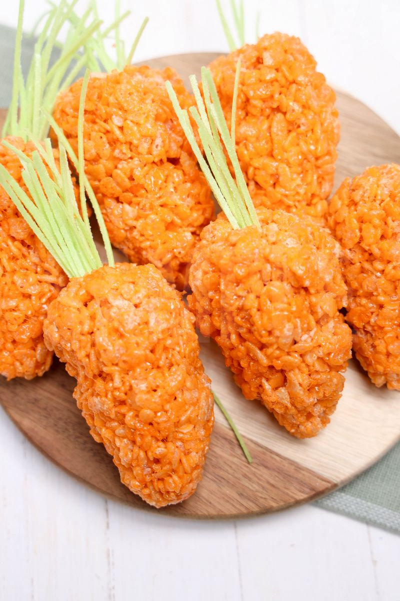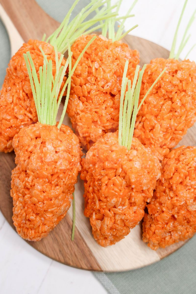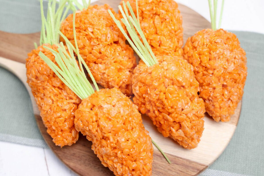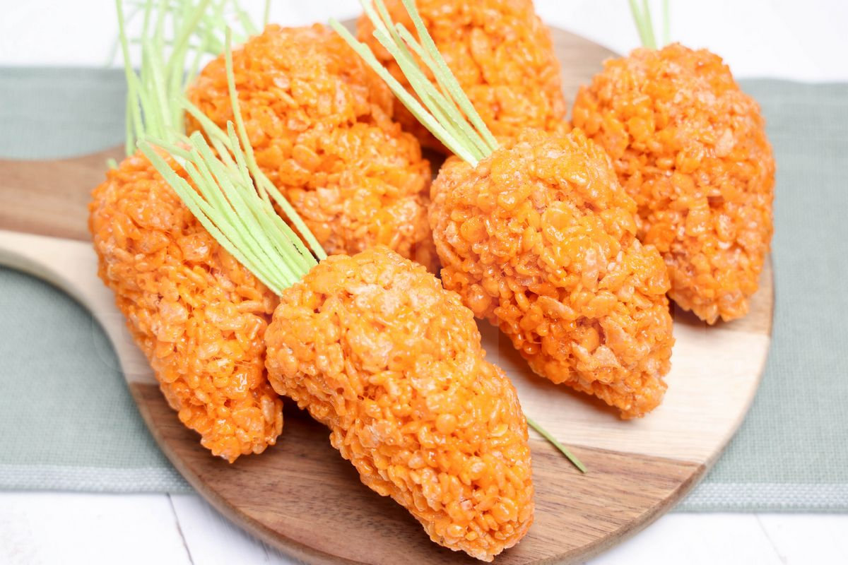 Carrot Rice Krispies Treats is made with rice krispies cereal, marshmallows, butter, edible grass, and orange food gel. This is a semi exclusive recipe. The Carrot Rice Krispies Treats comes on a wood board on a white wood backdrop. Set comes with 11 in process (in process are the same for all sets) and 19 final shots (finals are different for each set) along with recipe in text format. Both vertical and horizontal shots are available for social media. One set of four. Sample removed on finals.