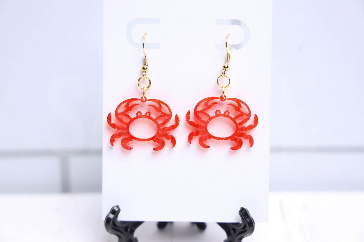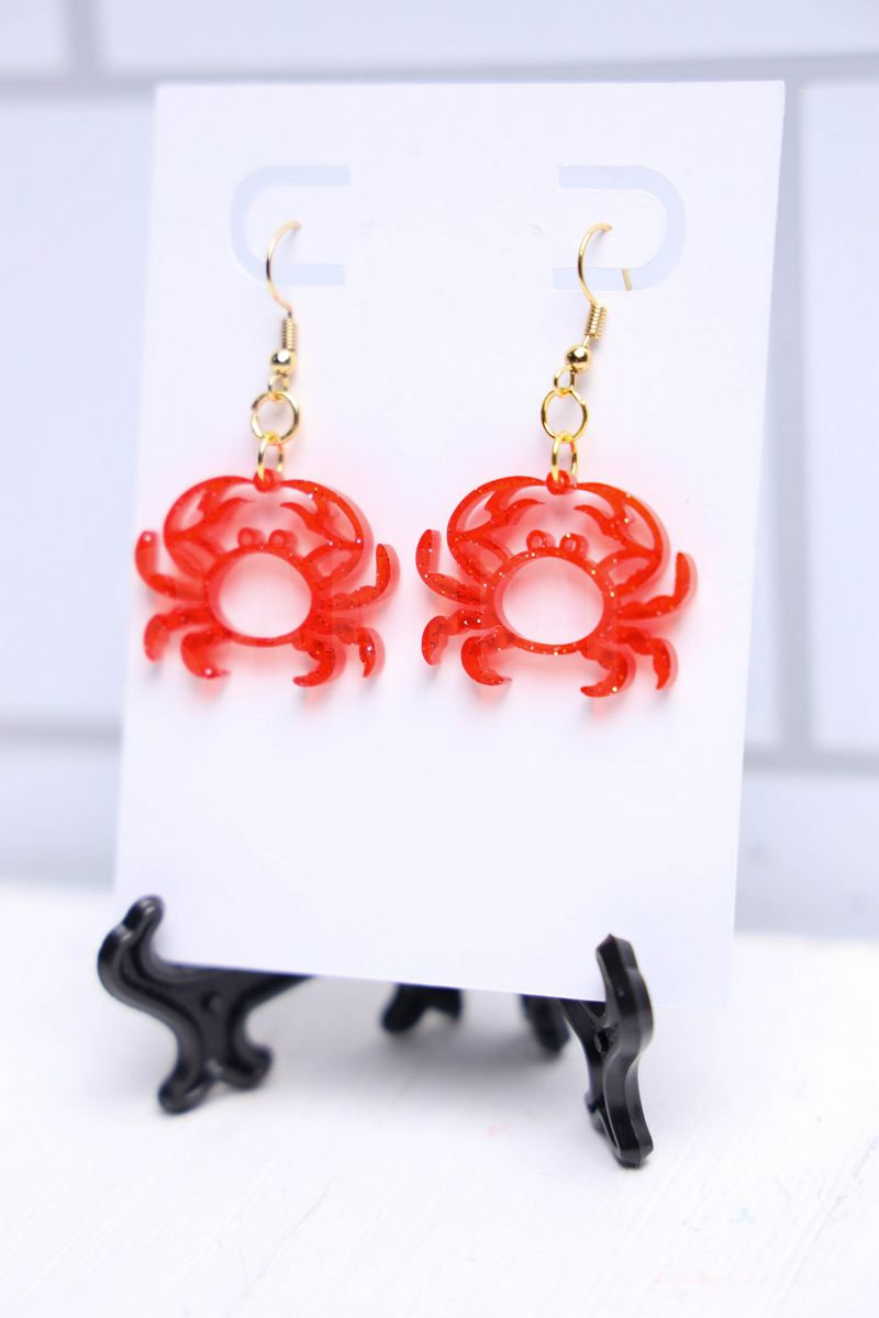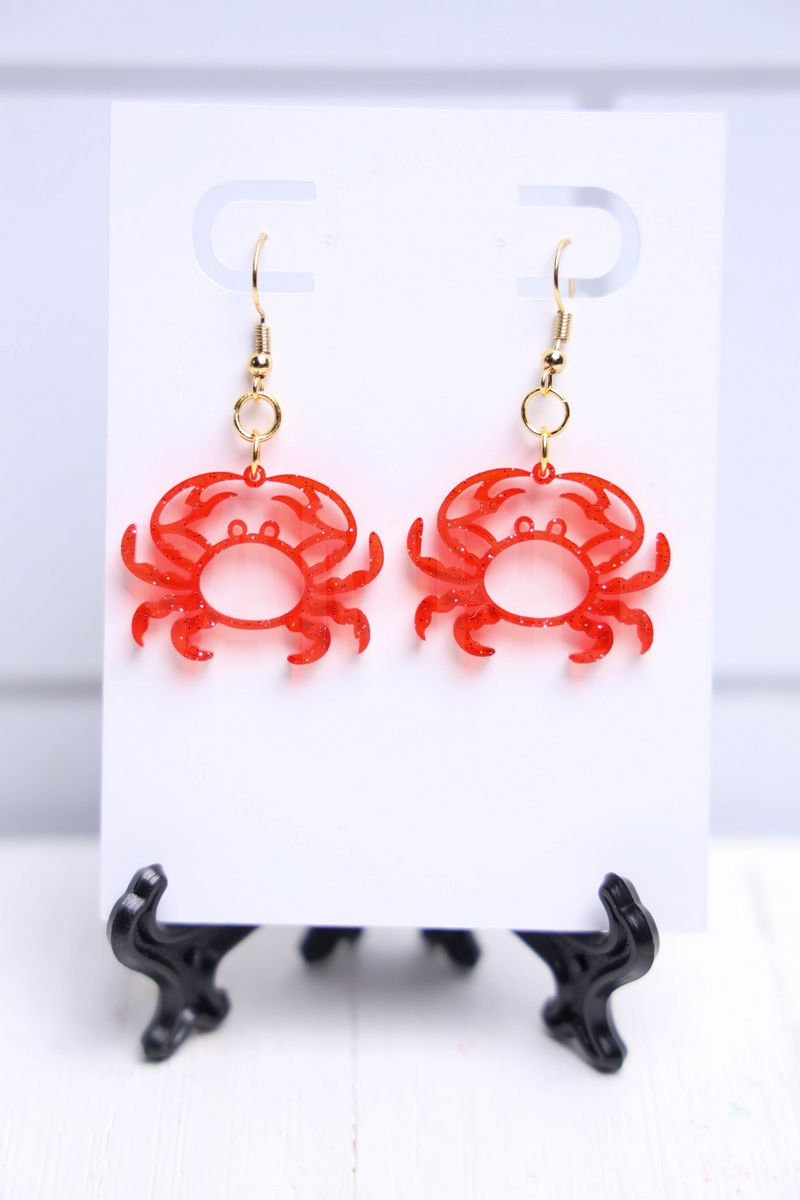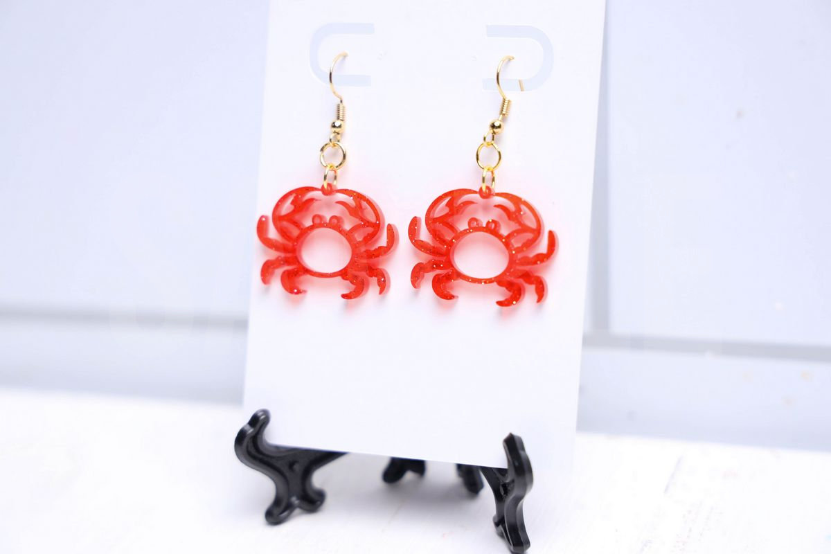 Crab Earrings is made with acrylic, laser machine, and earring parts. This is a semi exclusive craft. The Crab Earrings comes on a white card with a white wood backdrop. Set comes with 18 in process and 11 final shots (all in process sets in semi exclusive are the same) along with SVG and tutorial in text format. Both vertical and horizontal shots are available for social media. One set of two. Sample removed on finals.