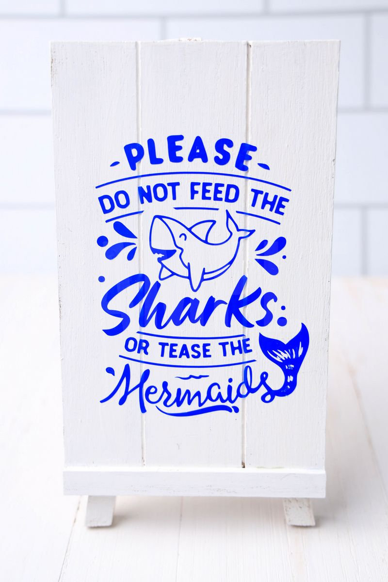 Do Not Feed The Sharks Cricut Dollar Tree DIY is made with blue oracal vinyl, cricut machine, and wood easel (Dollar Tree). This is a semi exclusive craft. The Do Not Feed The Sharks Cricut Dollar Tree DIY comes pictured on a white wood backdrop. Set comes with 11 in process, 3 screenshots (in process and screenshots are the same for all sets), and 17 final shots (finals are different for each set) along with tutorial in text format and SVG file (not to be resold but great for free opt in’s). Both vertical and horizontal shots are available for social media. One set of four. Sample removed on finals.