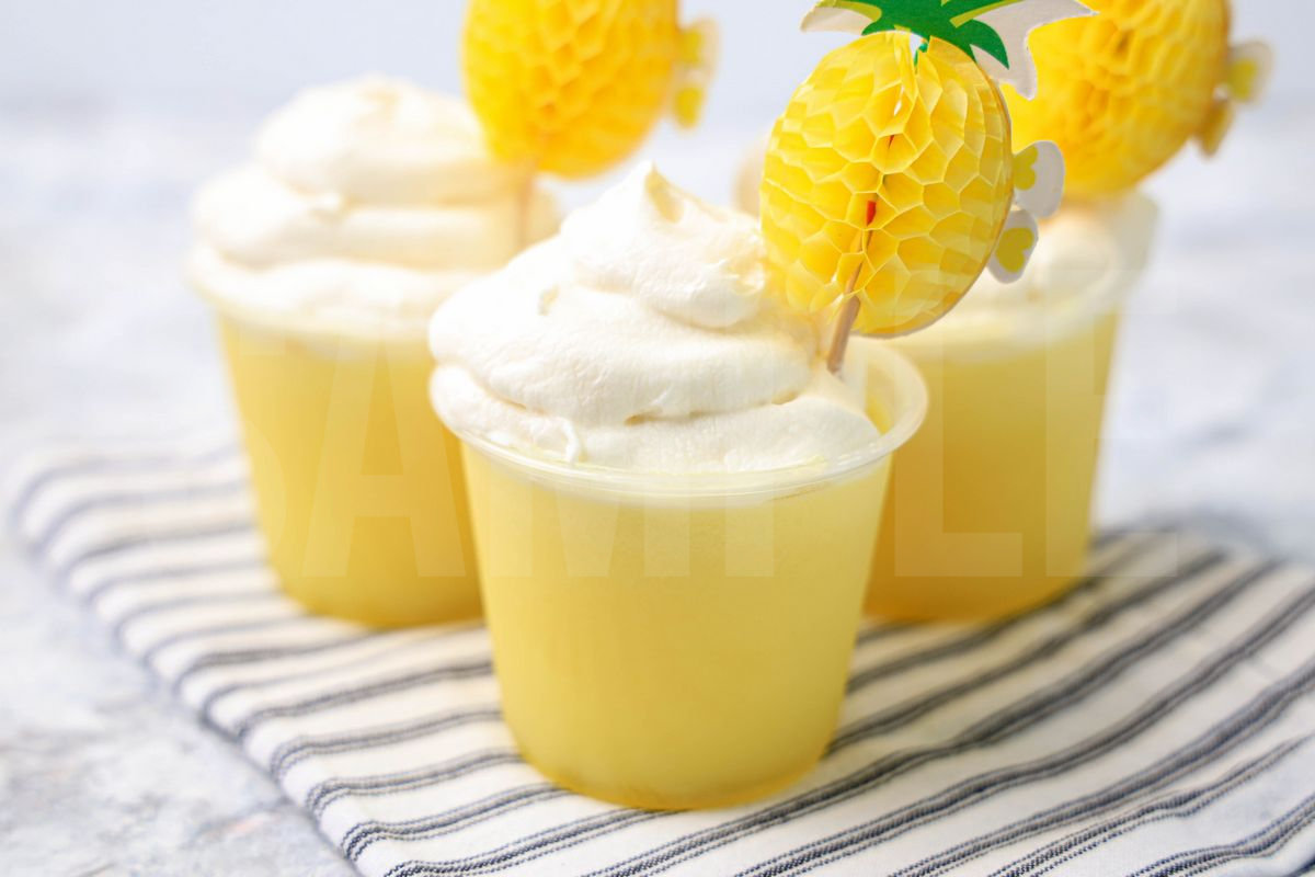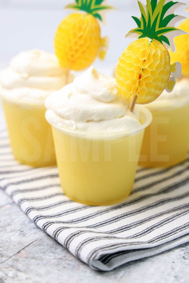 Dole Whip Jello Shots is made with pineapple jello, pineapple juice, and heavy whipping cream. Recipe written with and without alcohol. This is a semi exclusive recipe. The Dole Whip Jello Shots comes on white striped napkin on a marble backdrop. Set comes with 12 in process (in process are the same for all sets) and 15 final shots (finals are different for each set) along with recipe in text format. Both vertical and horizontal shots are available for social media. One set of four. Sample removed on finals.