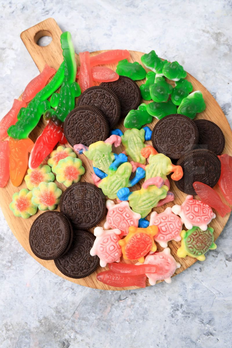 Earth Day Charcuterie Board is made with oreos, gummy frogs, and gummy flowers. This is a semi exclusive recipe. The Earth Day Charcuterie Board comes on a wood charcuterie board on a marble backdrop. Set comes with 8 in process (in process are the same for all sets) and 16 final shots (finals are different for each set) along with recipe in text format. Both vertical and horizontal shots are available for social media. One set of four. Sample removed on finals.