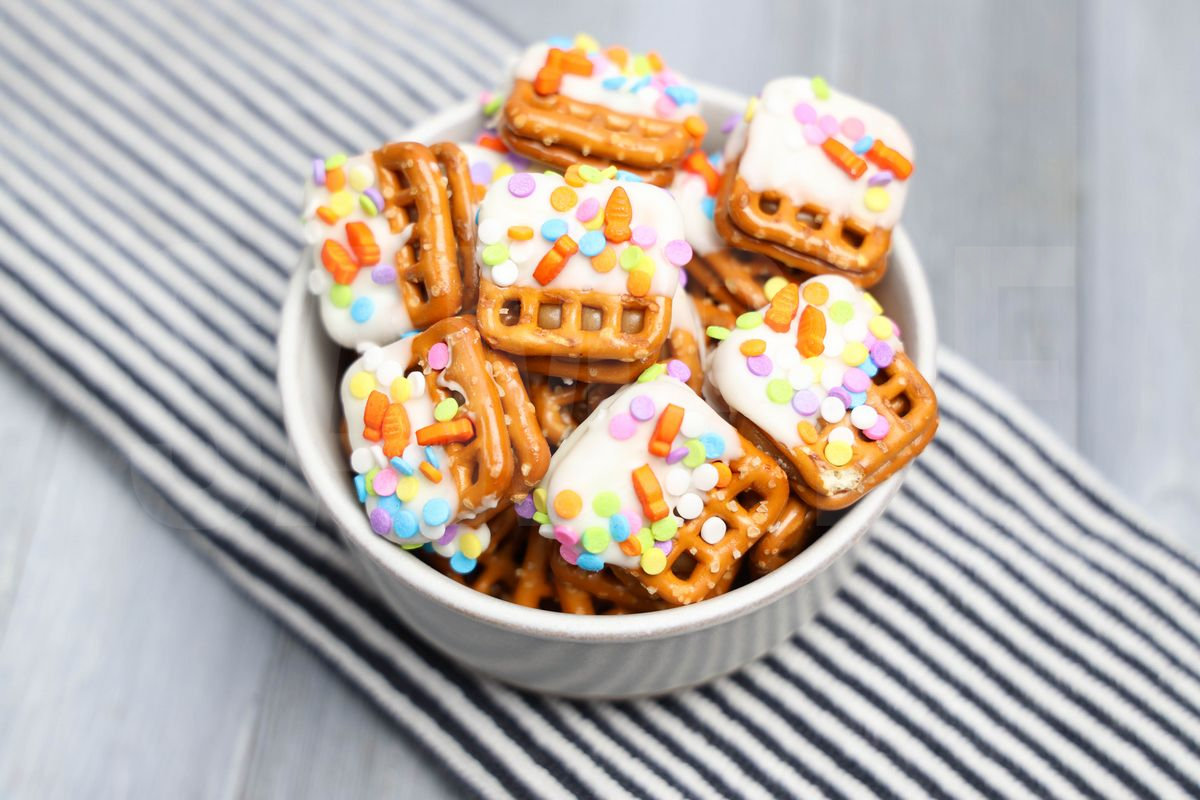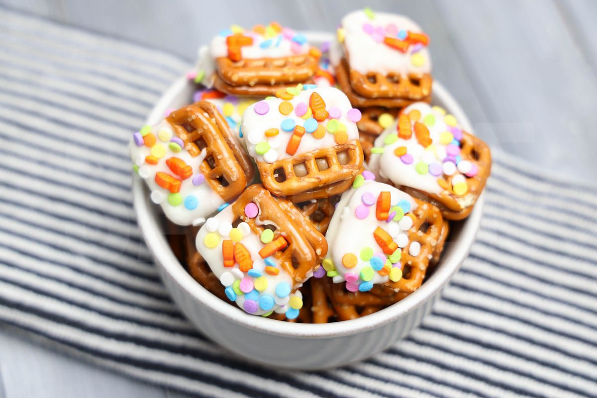 Easter Caramel Pretzels is made with Ghirardelli’s white chocolate, pretzels, sprinkles, and caramel. This is a semi exclusive recipe. The Easter Caramel Pretzels comes in a white bowl on a gray wood backdrop. Set comes with 12 in process (in process are the same for all sets) and 17 final shots (finals are different for each set) along with recipe in text format. Both vertical and horizontal shots are available for social media. One set of four. Sample removed on finals.