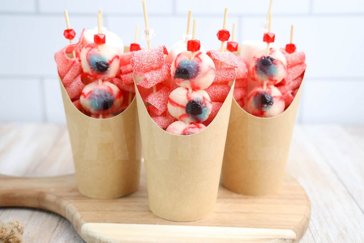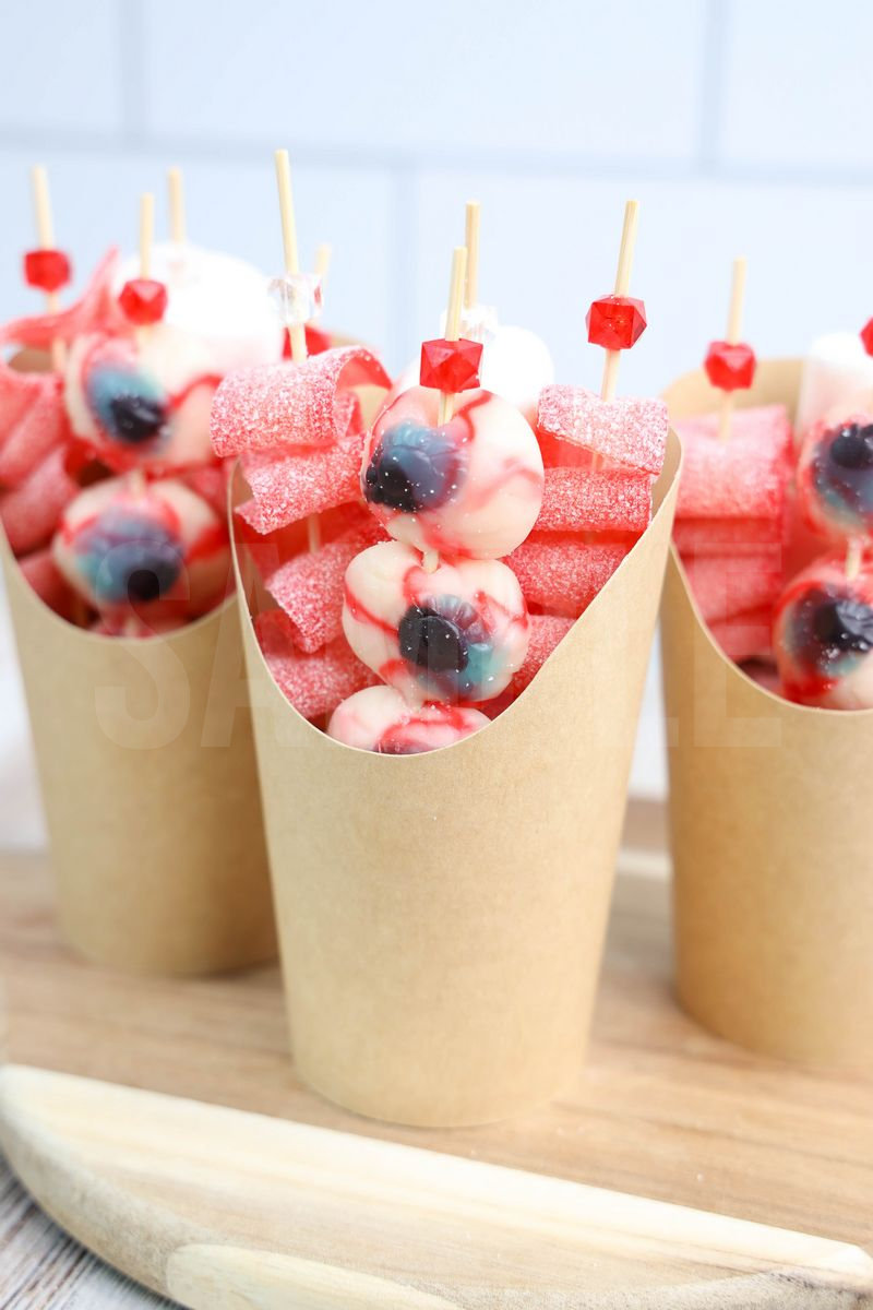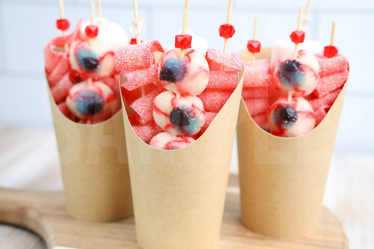 Eyeball Candy Cups is made with sour strips, marshmallows, and eyeball gummies. This is a semi exclusive recipe. The Eyeball Candy Cups comes in a brown fry cup with rustic wood backdrop. Set comes with 8 in process (in process are the same for all sets) and 19 final shots (finals are different for each set) along with recipe in text format. Both vertical and horizontal shots are available for social media. One set of four. Sample removed on finals.