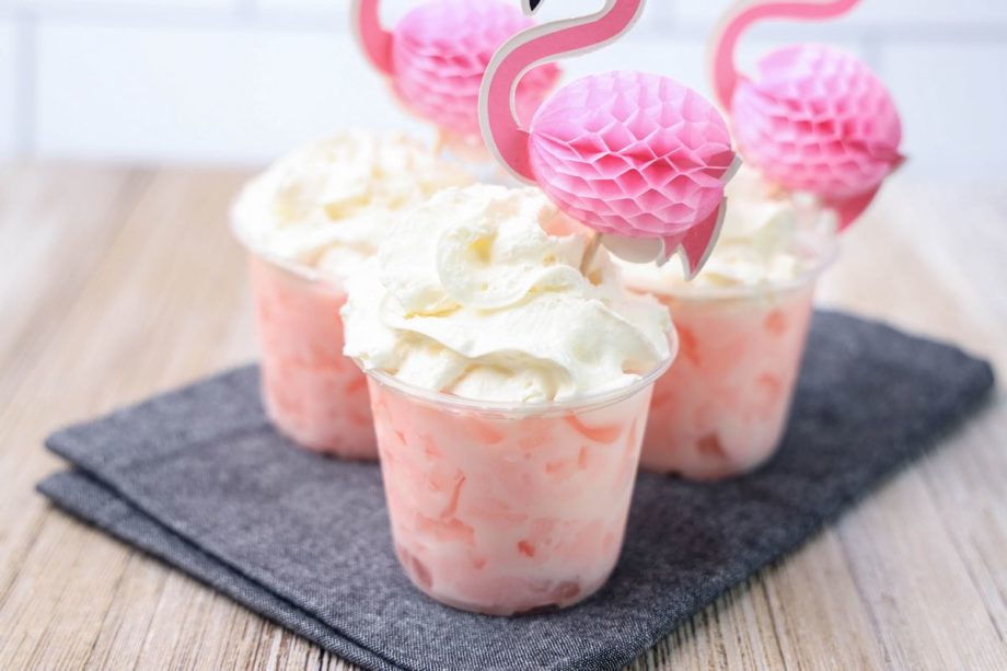 Flamingo Stained Glass Jello Shots is made with pink starburst jello, heavy whipping cream, and whipped topping. Recipe written with and without alcohol. This is a semi exclusive recipe. The Flamingo Stained Glass Jello Shots comes on denim napkin on a rustic wood backdrop. Set comes with 12 in process (in process are the same for all sets) and 14 final shots (finals are different for each set) along with recipe in text format. Both vertical and horizontal shots are available for social media. One set of four. Sample removed on finals.