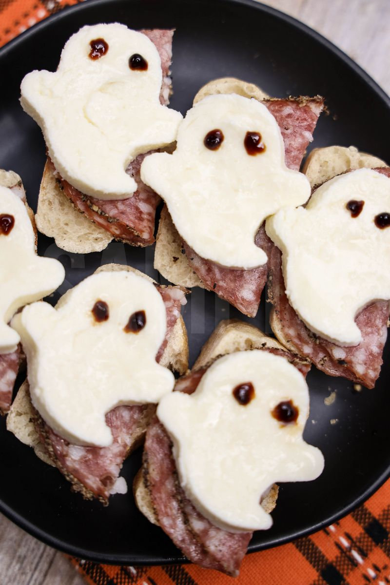 Ghost Salami Crostini is made with fresh mozzarella, crostini bread, peppered salami, and balsamic glaze. This is a semi exclusive recipe. The Ghost Salami Crostini comes on a black plate with a rustic wood backdrop. Set comes with 7 in process (in process are the same for all sets) and 15 final shots (finals are different for each set) along with recipe in text format. Both vertical and horizontal shots are available for social media. One set of four. Sample removed on finals.