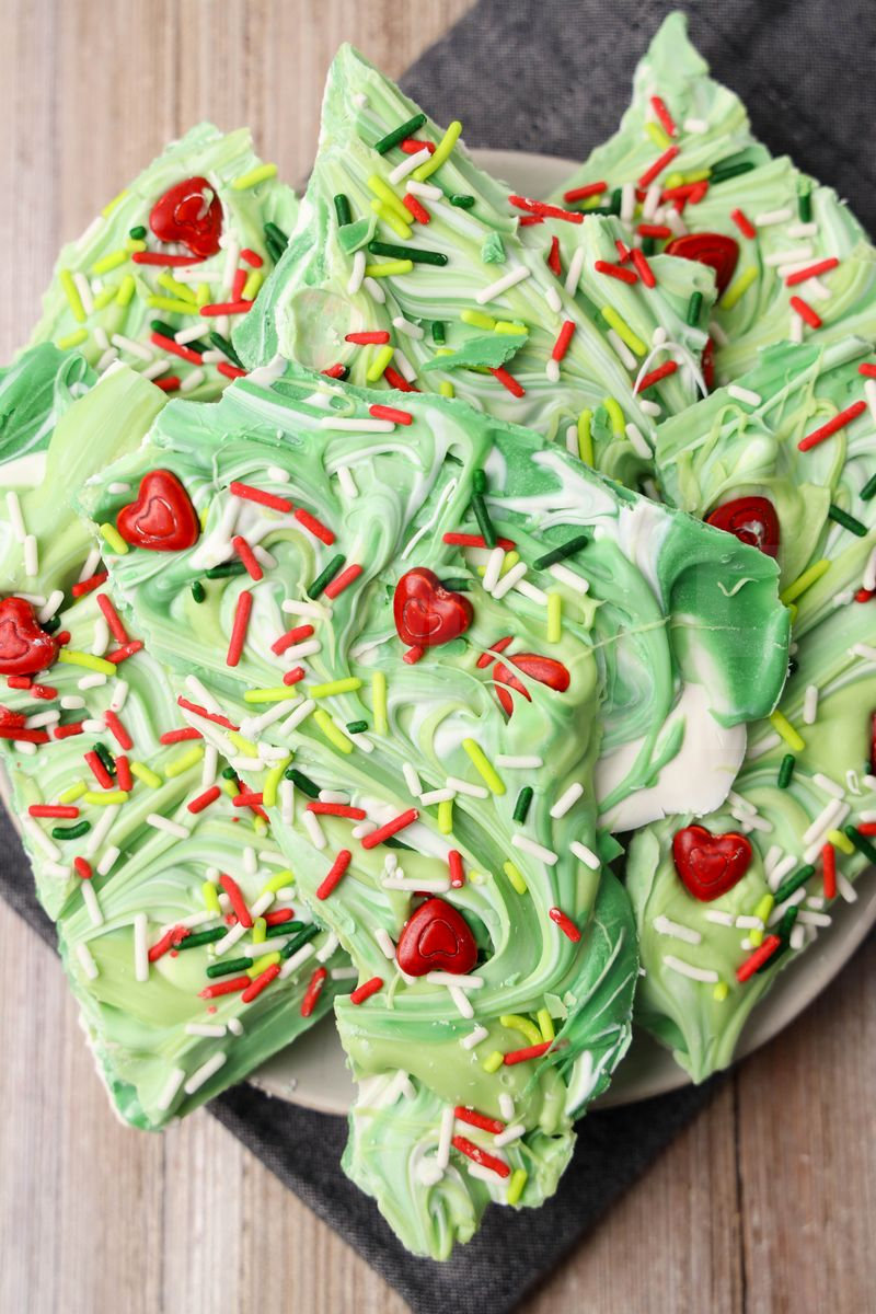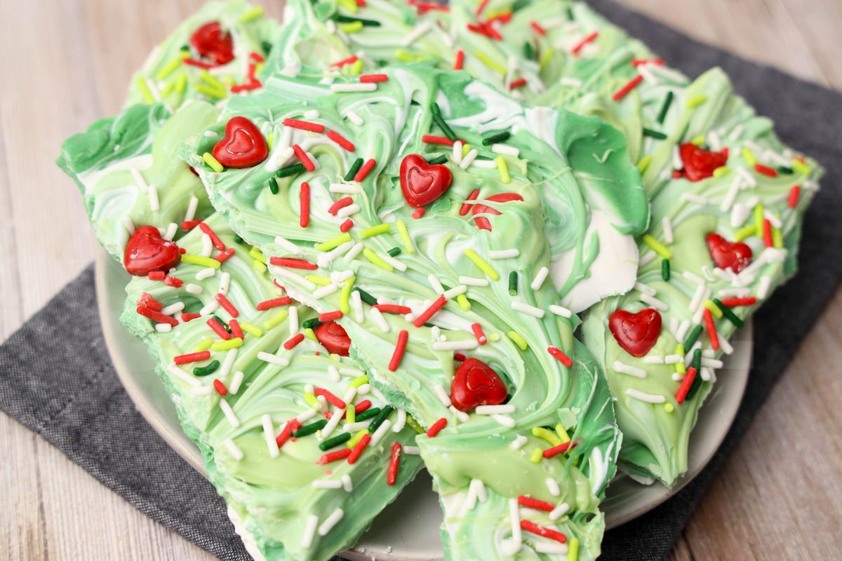 Grinch Bark is made with green candy melts, white candy melts, and sprinkles. This is a semi exclusive recipe. The Grinch Bark comes on a white plate with a denim napkin on a rustic wood backdrop. Set comes with 10 in process (in process are the same for all sets) and 15 final shots (finals are different for each set) along with recipe in text format. Both vertical and horizontal shots are available for social media. One set of four. Sample removed on finals.