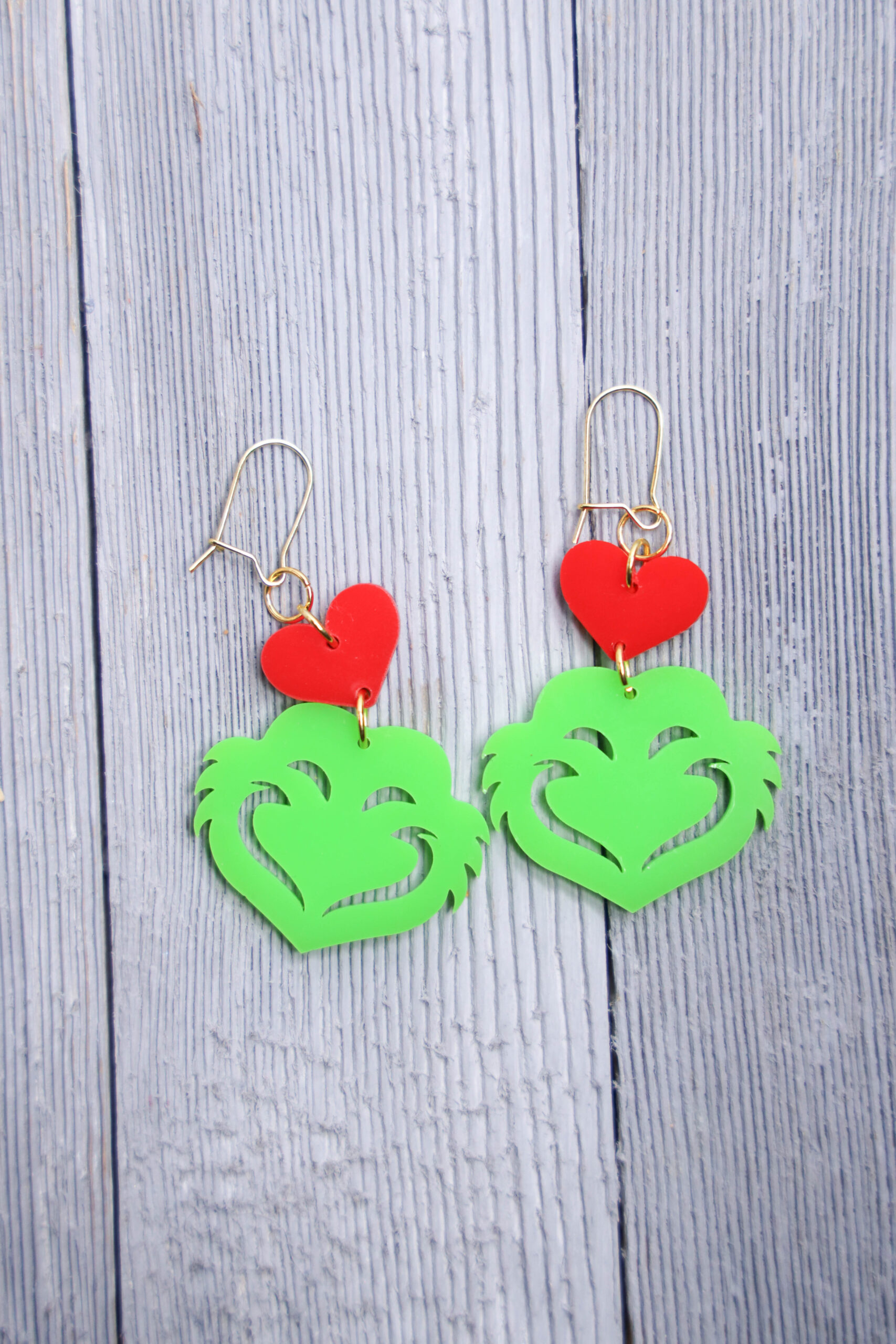 Grinch Face Earrings Exclusive made with acrylic and svg. This is a exclusive craft. The Grinch Face Earrings Exclusive on a gray wood backdrop. Set comes with 6 in process and 6 final shots along with tutorial in text format and videos already sent. Both vertical and horizontal shots are available for social media. Sample removed on finals.