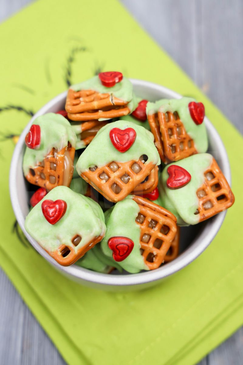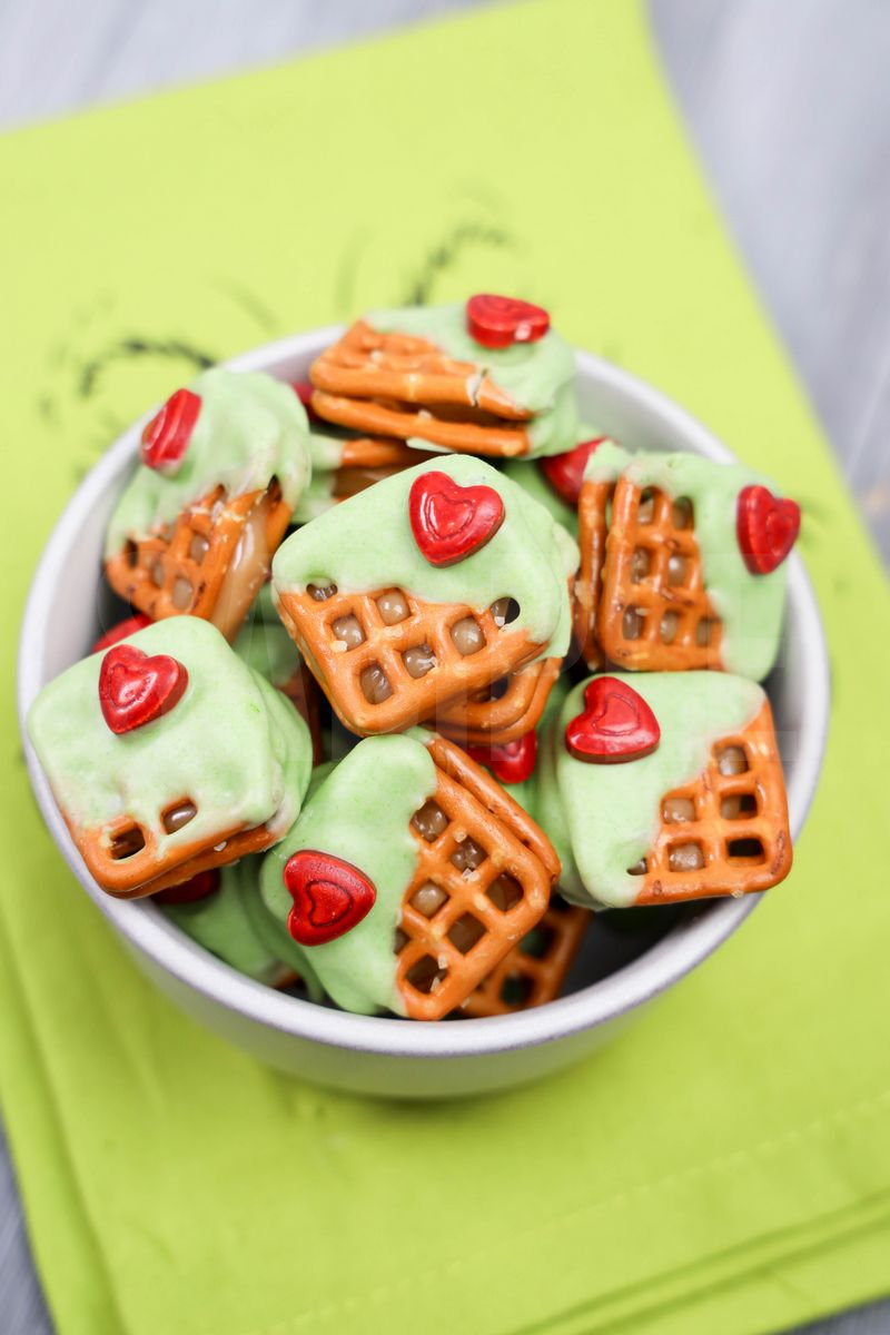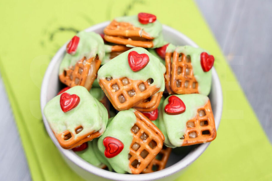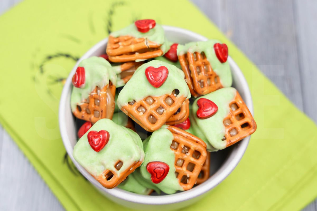 Grinch Heart Pretzel Bites is made with pretzels, sea salted caramel, Ghirardelli’s white wafers, and red candy heart sprinkles. This is a semi exclusive recipe. The Grinch Heart Pretzel Bites comes in a white bowl with gray wood backdrop. Set comes with 18 in process (in process are the same for all sets) and 17 final shots (finals are different for each set) along with recipe in text format. Both vertical and horizontal shots are available for social media. One set of four. Sample removed on finals.