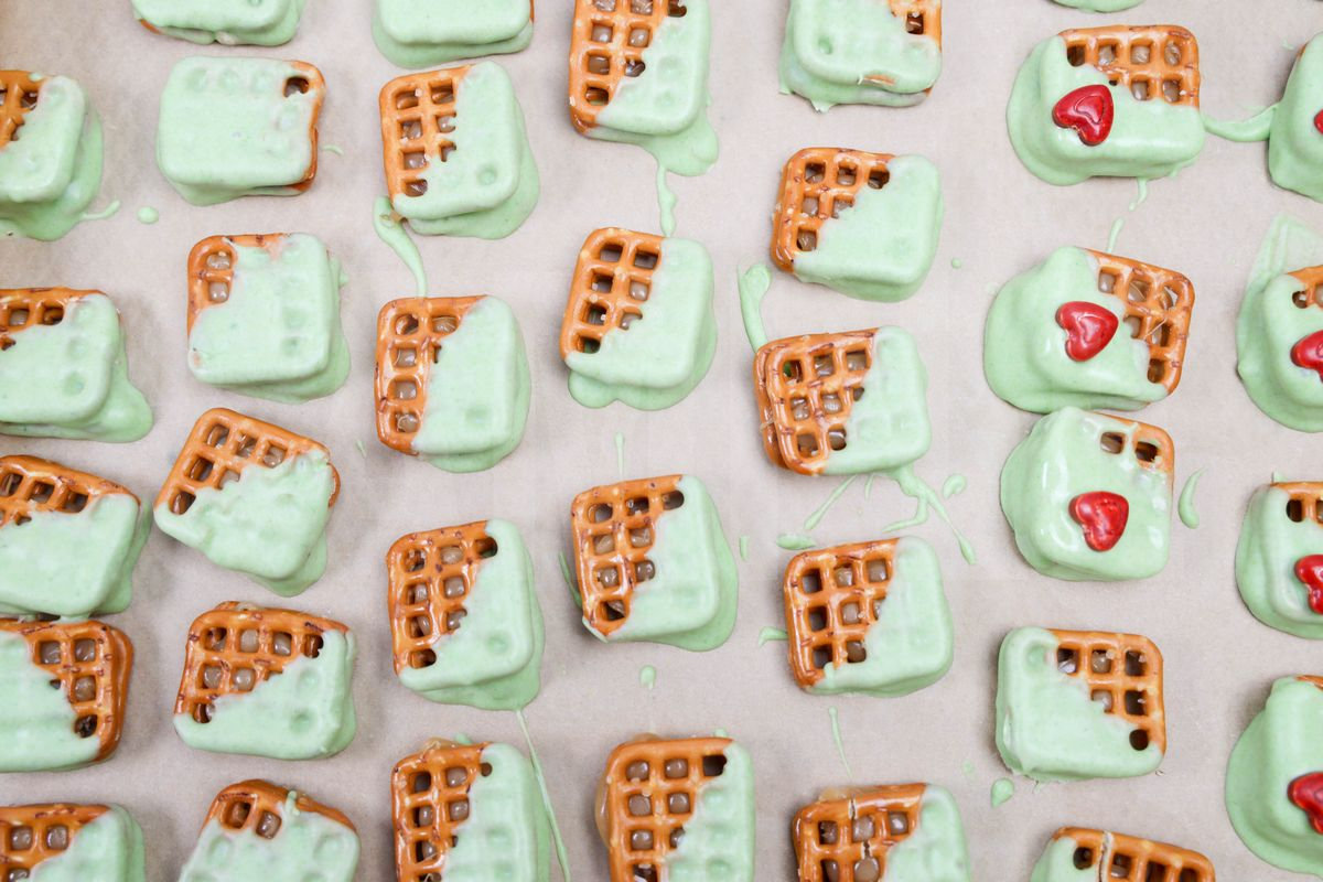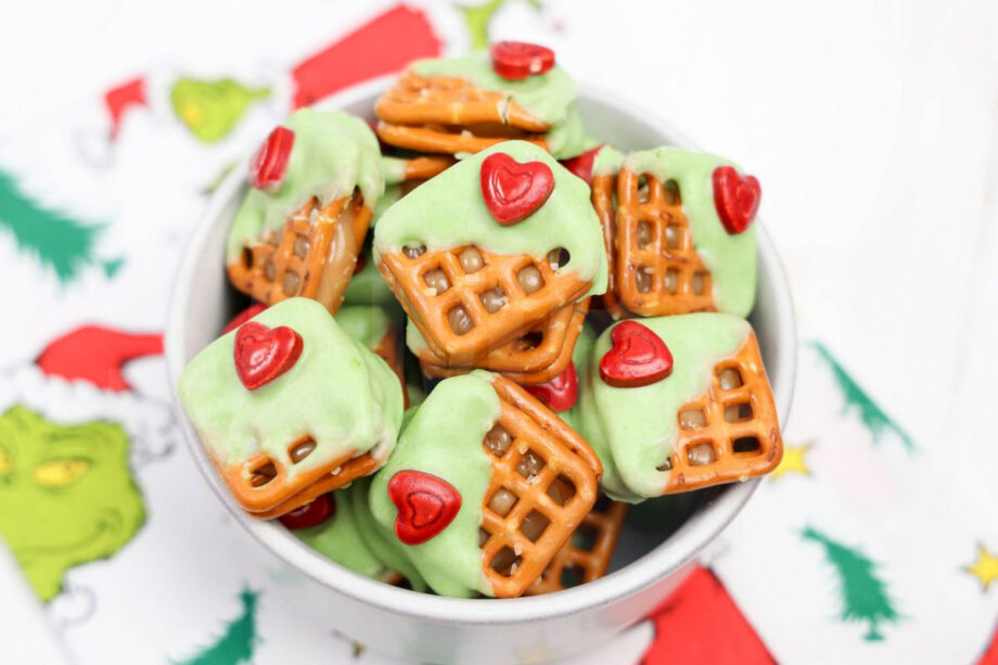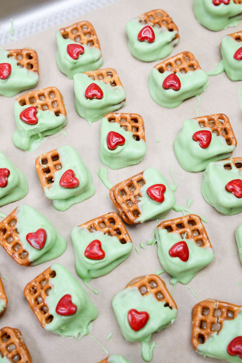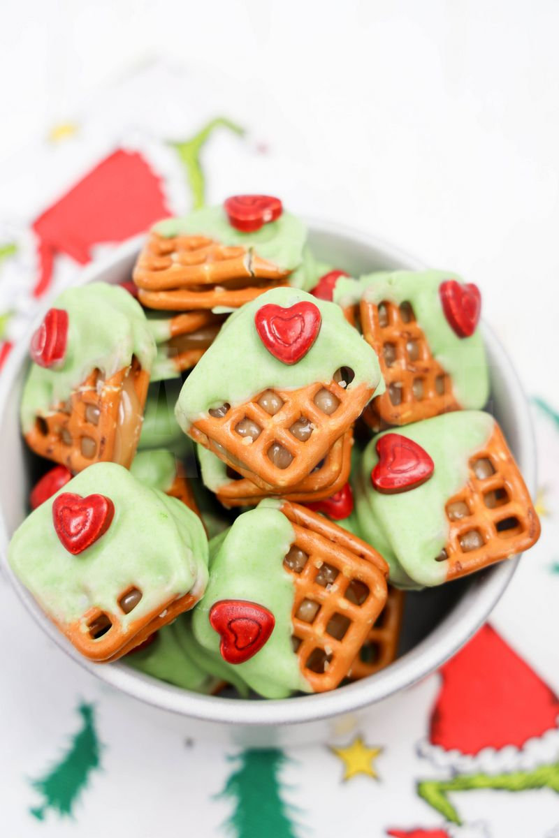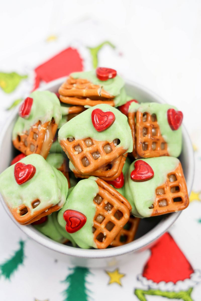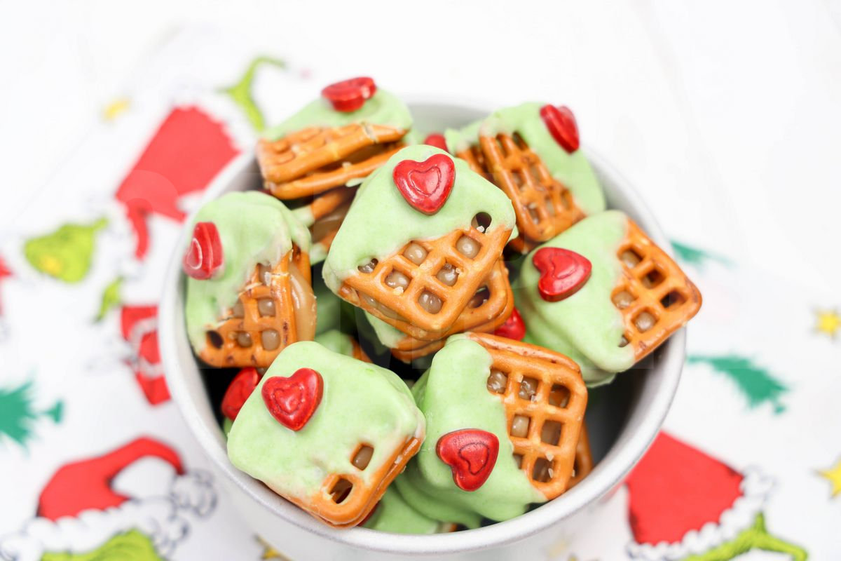Grinch Heart Pretzel Bites is made with pretzels, sea salted caramel, Ghirardelli’s white wafers, and red candy heart sprinkles. This is a semi exclusive recipe. The Grinch Heart Pretzel Bites comes in a white bowl with white wood backdrop. Set comes with 18 in process (in process are the same for all sets) and 15 final shots (finals are different for each set) along with recipe in text format. Both vertical and horizontal shots are available for social media. One set of four. Sample removed on finals.