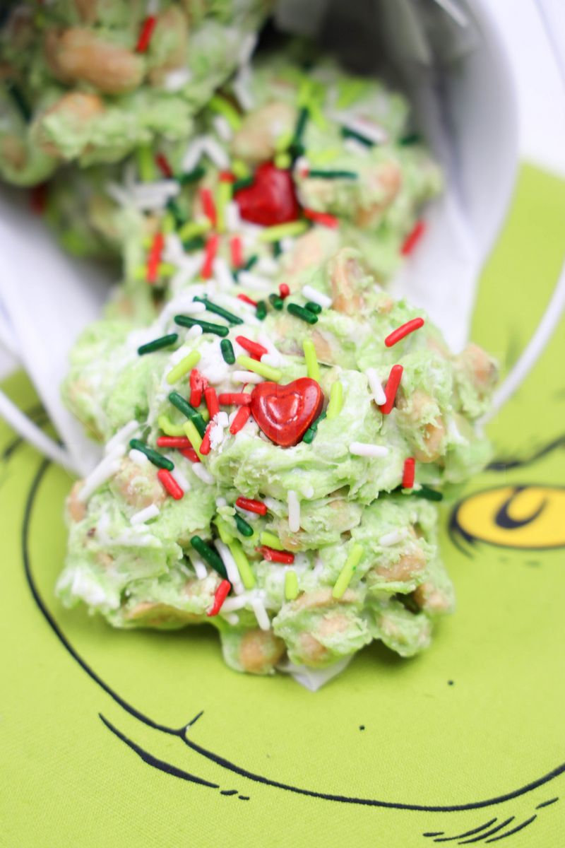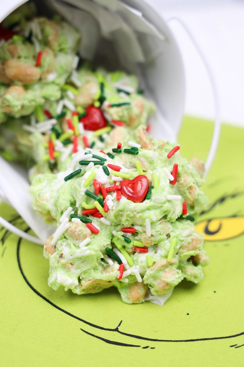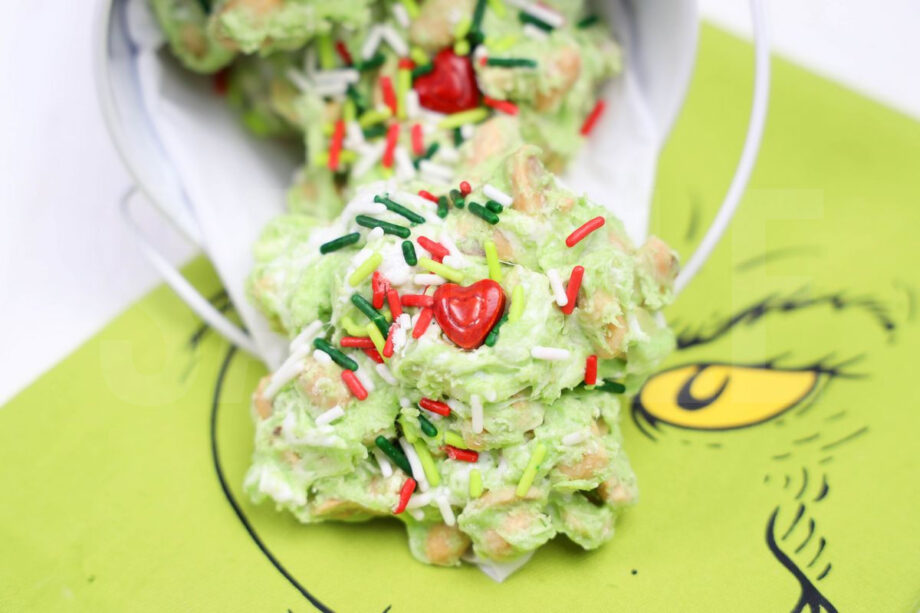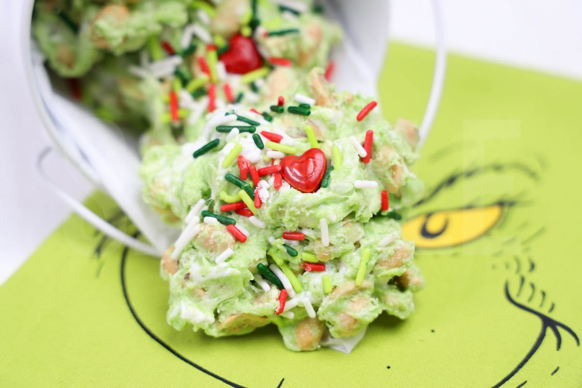 Grinch Poop Peanut Clusters is made with peanuts, white chocolate, almond bark, and marshmallows. This is a semi exclusive recipe. The Grinch Poop Peanut Clusters comes out of a white bucket with white wood backdrop. Set comes with 18 in process (in process are the same for all sets) and 18 final shots (finals are different for each set) along with recipe in text format. Both vertical and horizontal shots are available for social media. One set of four. Sample removed on finals.