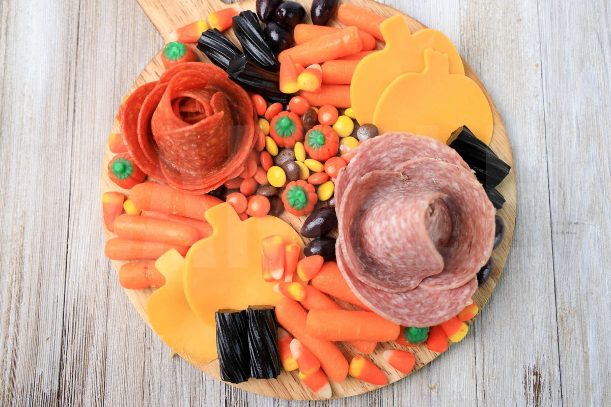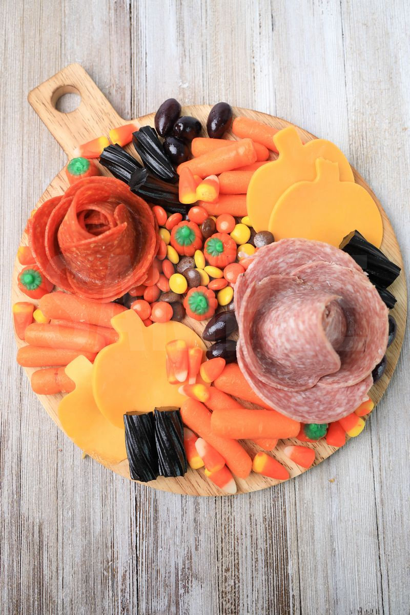 Halloween Charcuterie Board is made with pepperoni, salami, and candy corn. This is a semi exclusive recipe. The Halloween Charcuterie Board comes on a rustic wood backdrop. Set comes with 7 in process (in process are the same for all sets) and 21 final shots (finals are different for each set) along with recipe in text format. Both vertical and horizontal shots are available for social media. One set of four. Sample removed on finals.