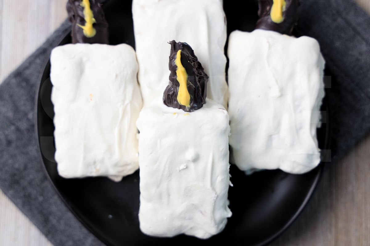 Hocus Pocus Black Flame Candle Krispy Treats is made with rice krispy treats, white candy melts, and black candy melts. This is a semi exclusive recipe. The Hocus Pocus Black Flame Candle Krispy Treats comes on a black plate with a denim napkin on a rustic wood backdrop. Set comes with 7 in process (in process are the same for all sets) and 15 final shots (finals are different for each set) along with recipe in text format. Both vertical and horizontal shots are available for social media. One set of four. Sample removed on finals.