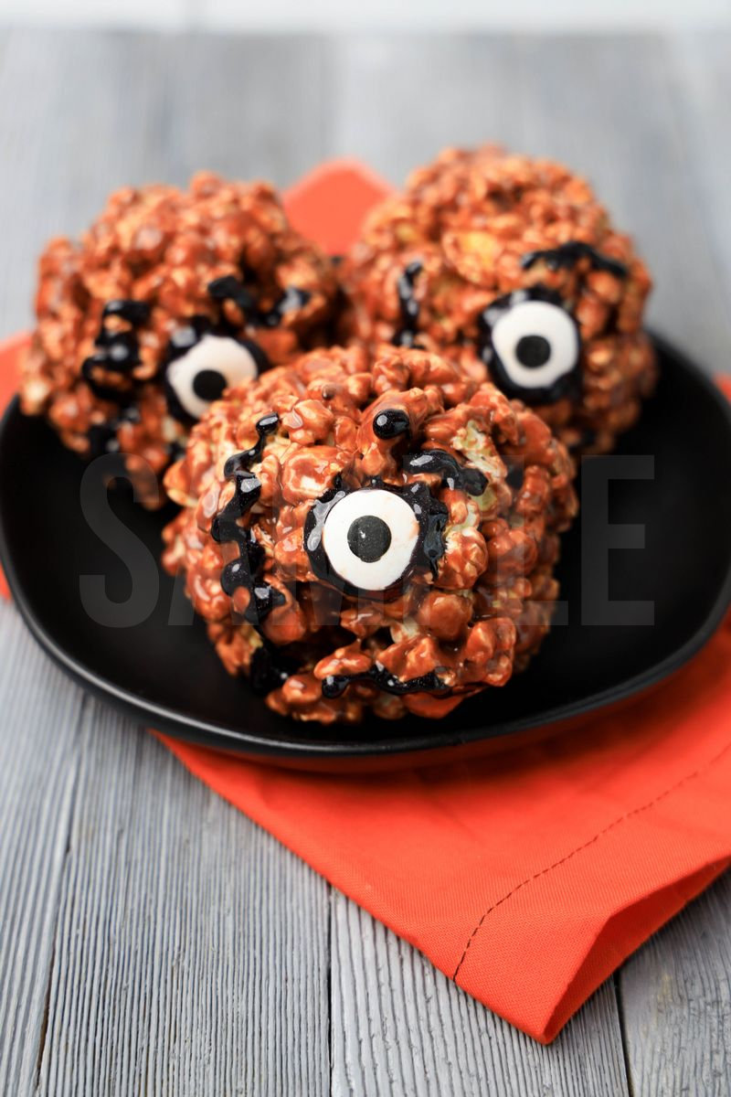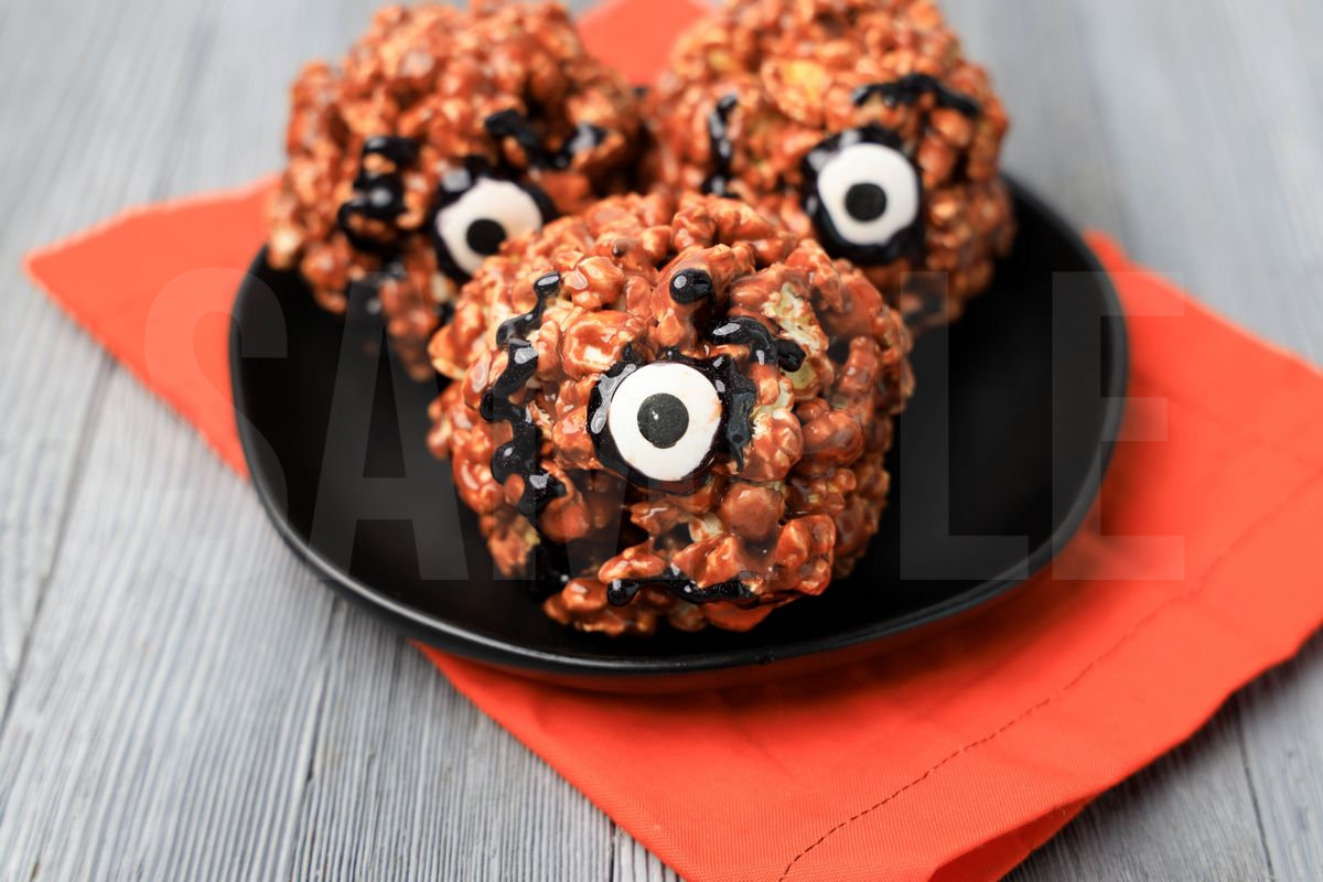 Hocus Pocus Book Of Spells Popcorn Balls is made with popcorn, marshmallows, and cocoa. This is a semi exclusive recipe. The Hocus Pocus Book Of Spells Popcorn Balls comes on a black plate with a orange napkin on a gray wood backdrop. Set comes with 9 in process (in process are the same for all sets) and 18 final shots (finals are different for each set) along with recipe in text format. Both vertical and horizontal shots are available for social media. One set of four. Sample removed on finals.