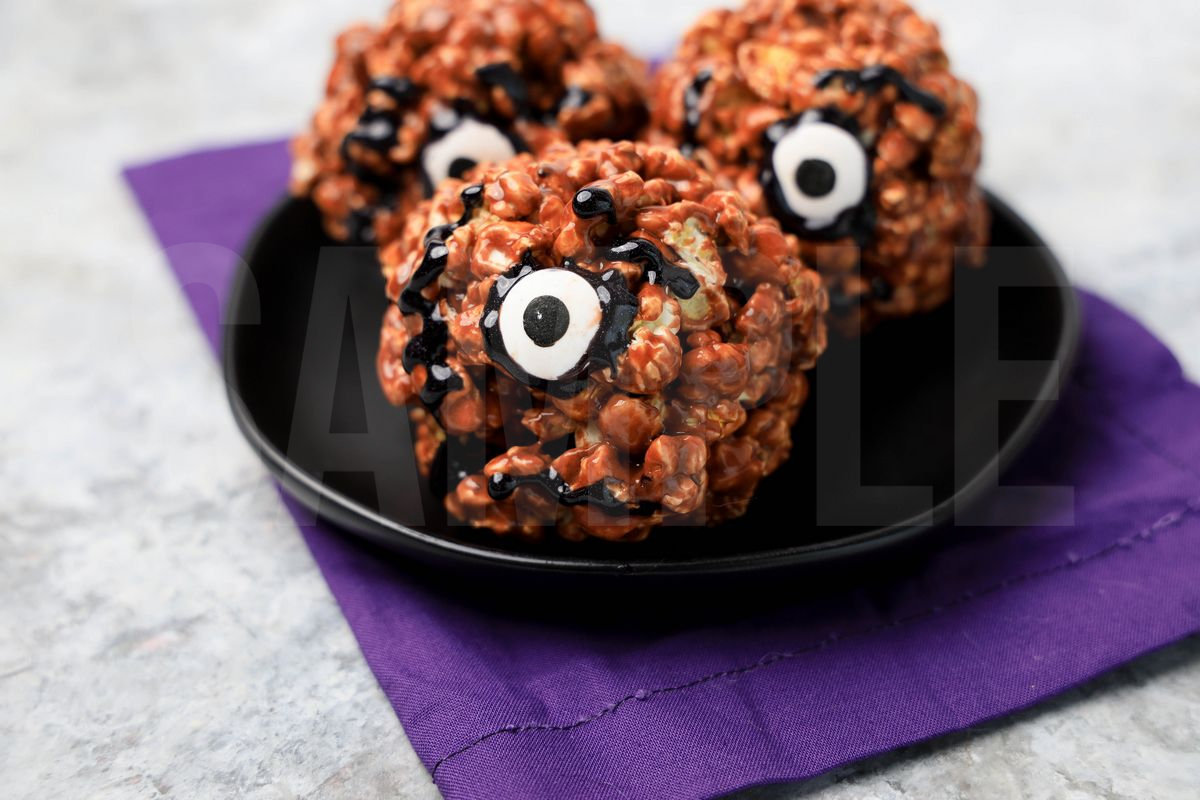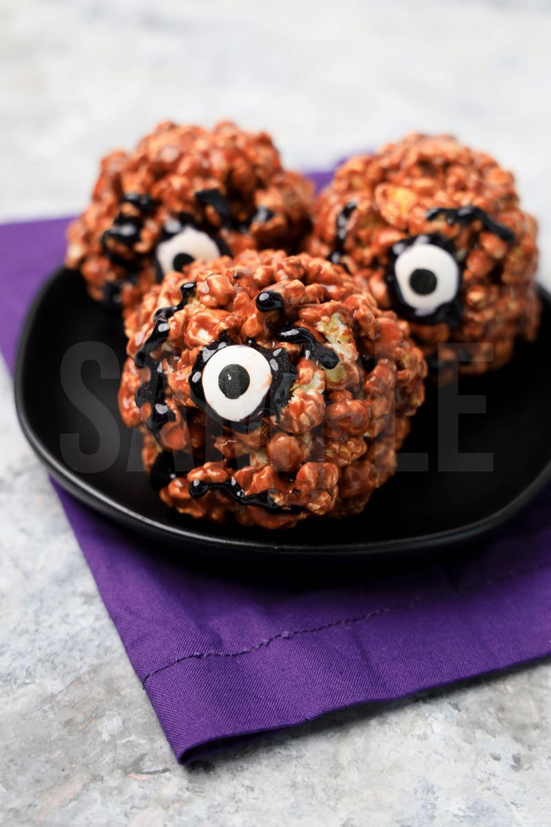 Hocus Pocus Book Of Spells Popcorn Balls is made with popcorn, marshmallows, and cocoa. This is a semi exclusive recipe. The Hocus Pocus Book Of Spells Popcorn Balls comes on a black plate with a purple napkin on a marble backdrop. Set comes with 9 in process (in process are the same for all sets) and 17 final shots (finals are different for each set) along with recipe in text format. Both vertical and horizontal shots are available for social media. One set of four. Sample removed on finals.