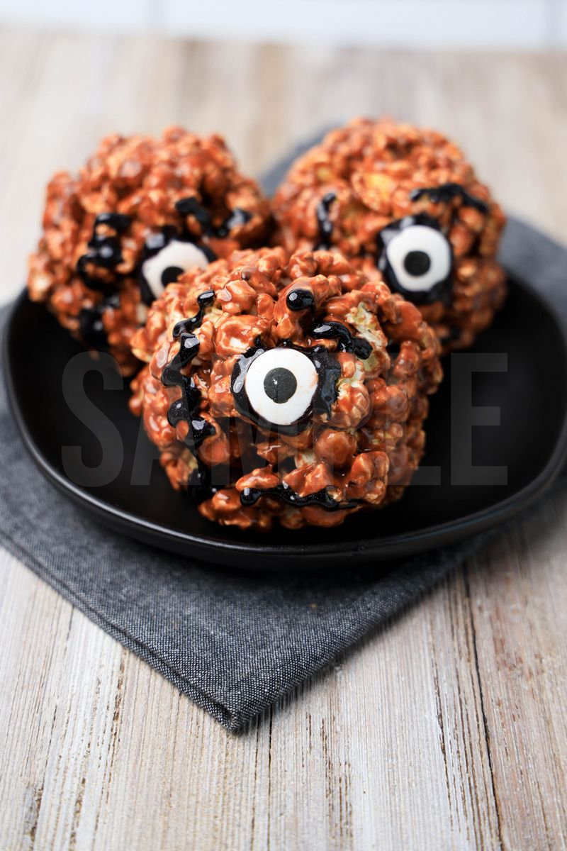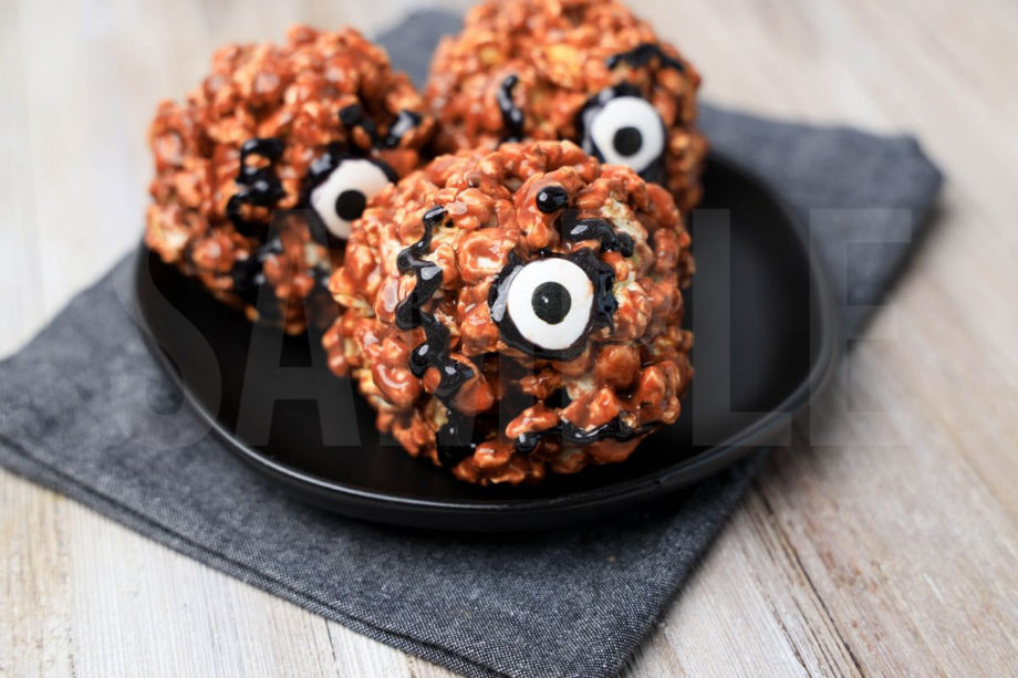 Hocus Pocus Book Of Spells Popcorn Balls is made with popcorn, marshmallows, and cocoa. This is a semi exclusive recipe. The Hocus Pocus Book Of Spells Popcorn Balls comes on a black plate with a denim napkin on a rustic wood backdrop. Set comes with 9 in process (in process are the same for all sets) and 18 final shots (finals are different for each set) along with recipe in text format. Both vertical and horizontal shots are available for social media. One set of four. Sample removed on finals.