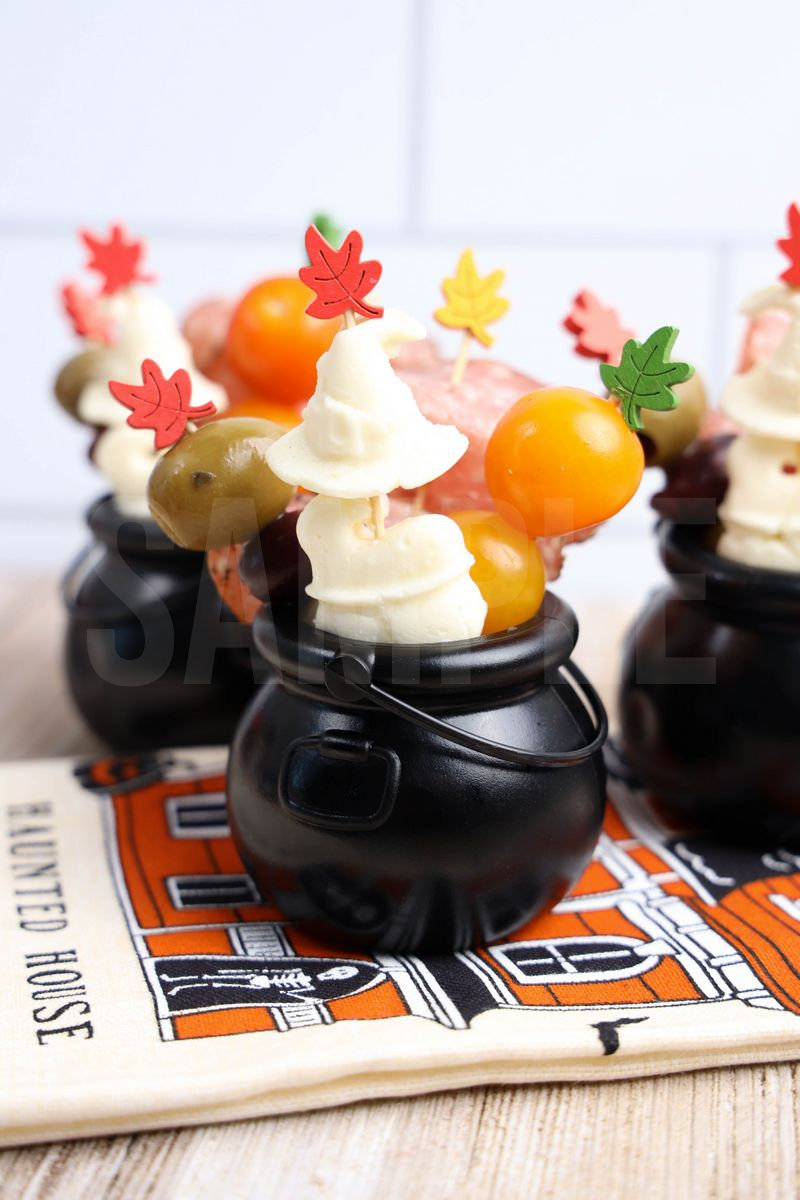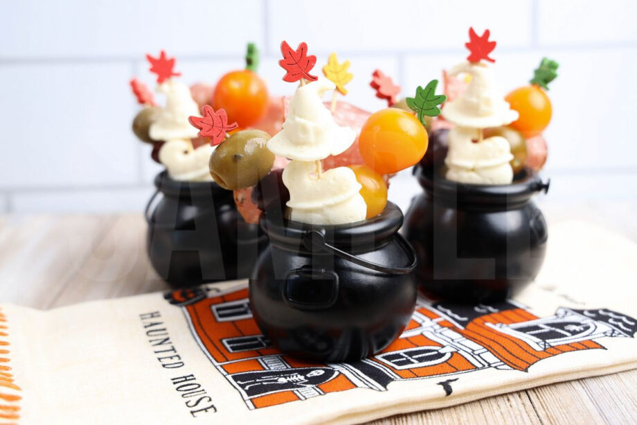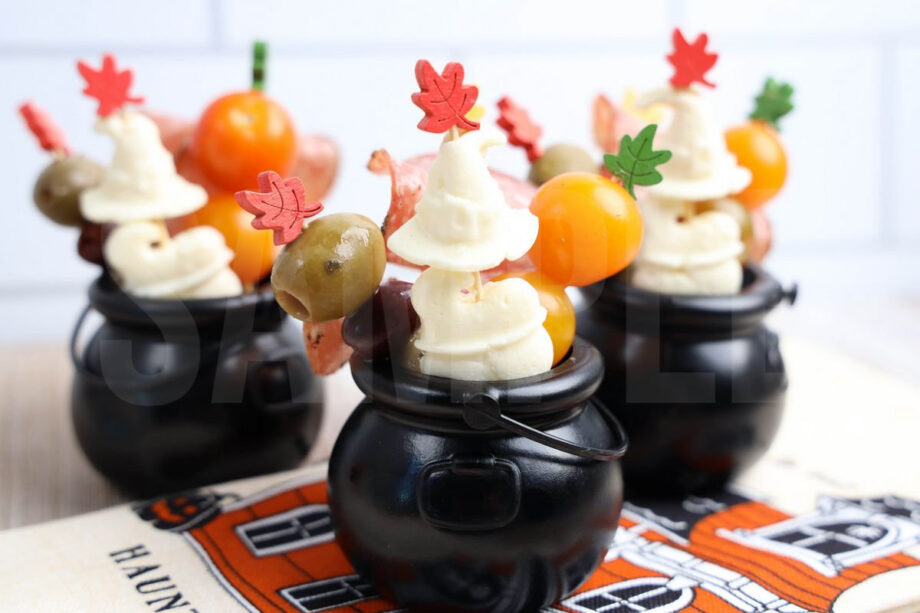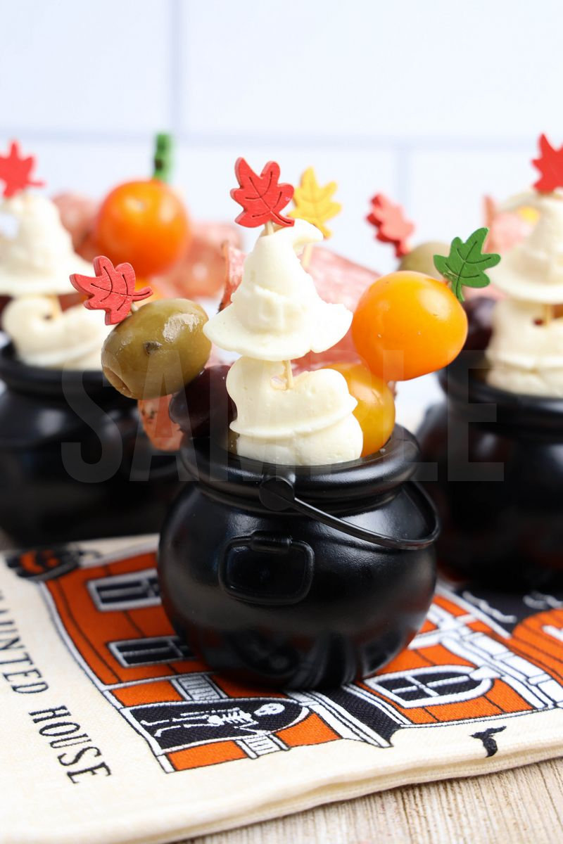 Hocus Pocus Charcuterie Cauldrons is made with olives, peppered salami, fresh mozzarella cheese, and tomatoes. This is a semi exclusive recipe. The Hocus Pocus Charcuterie Cauldrons come on a rustic wood backdrop. Set comes with 9 in process (in process are the same for all sets) and 19 final shots (finals are different for each set) along with recipe in text format. Both vertical and horizontal shots are available for social media. One set of four. Sample removed on finals.