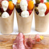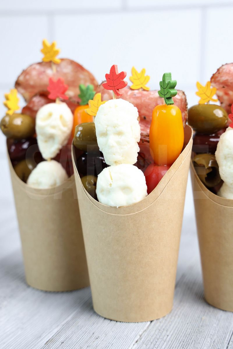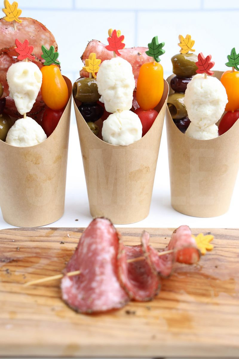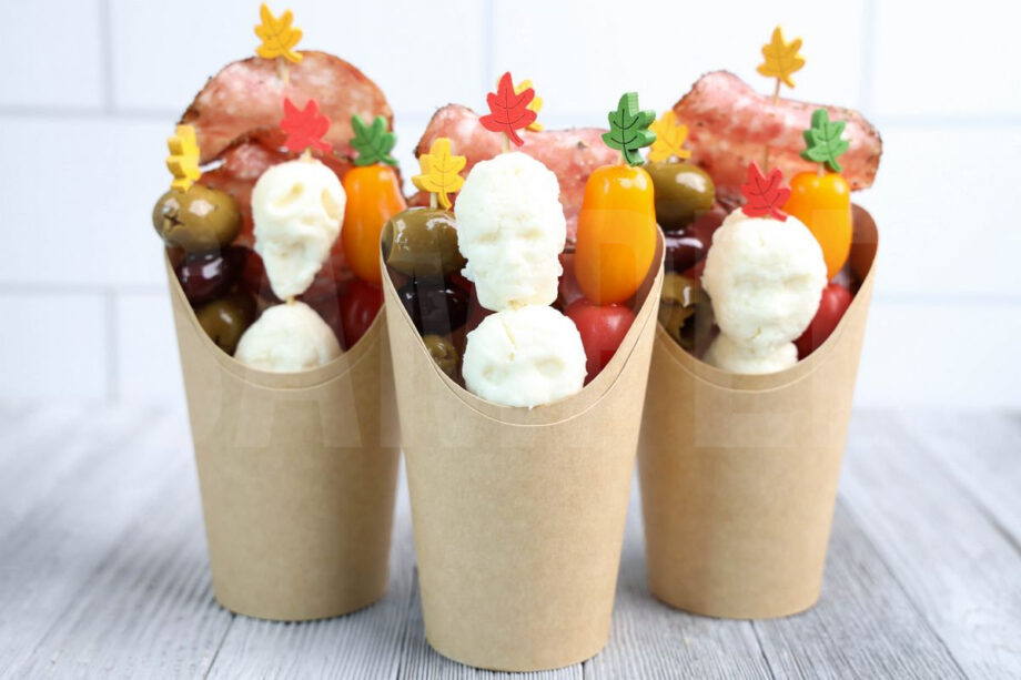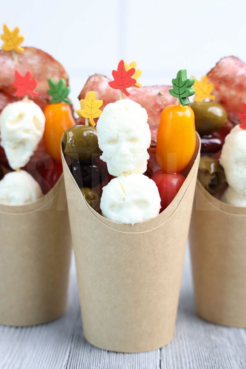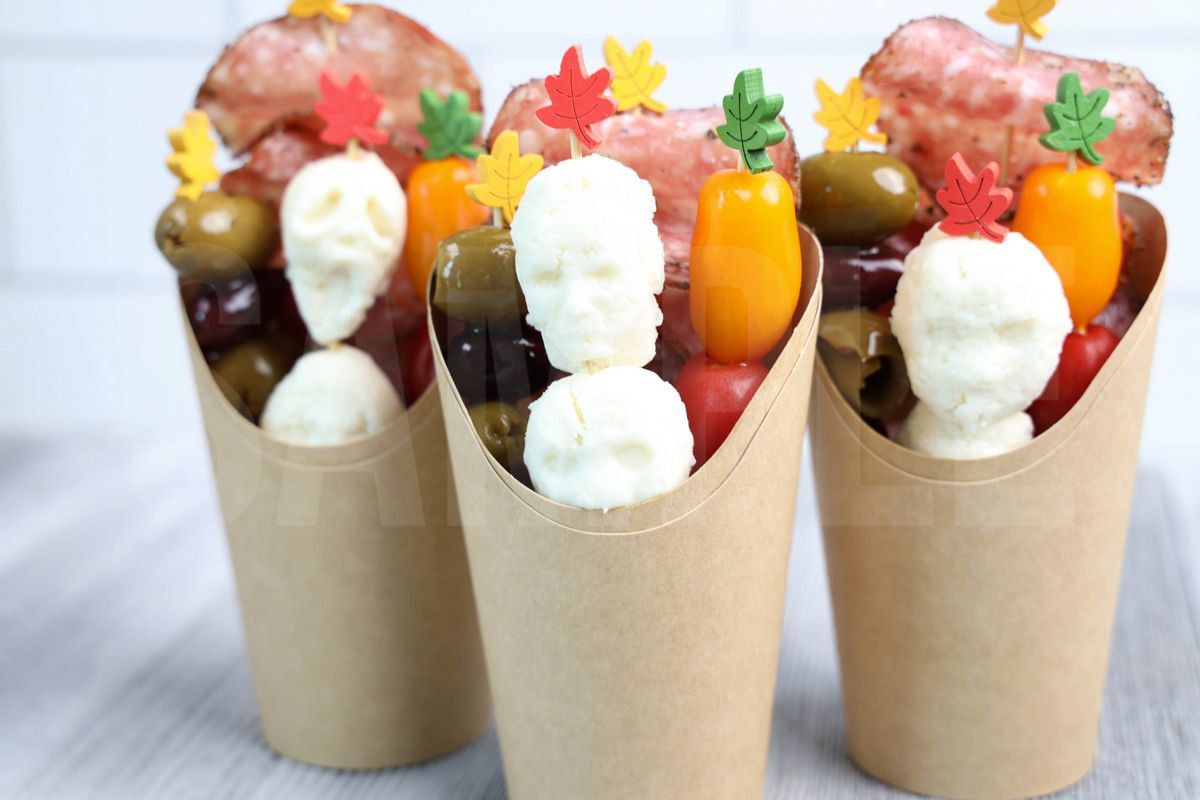 Horror Movie Charcuterie Cups is made with olives, peppered salami, heirloom tomatoes, and fresh mozzarella. This is a semi exclusive recipe. The Horror Movie Charcuterie Cups comes in a brown fry cup with gray wood backdrop. Set comes with 9 in process (in process are the same for all sets) and 20 final shots (finals are different for each set) along with recipe in text format. Both vertical and horizontal shots are available for social media. One set of four. Sample removed on finals.