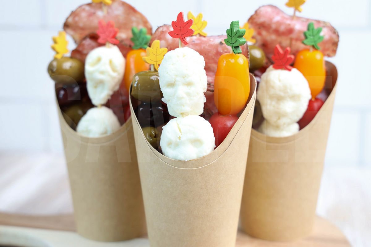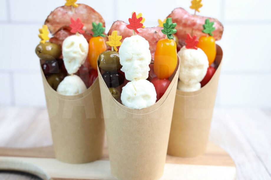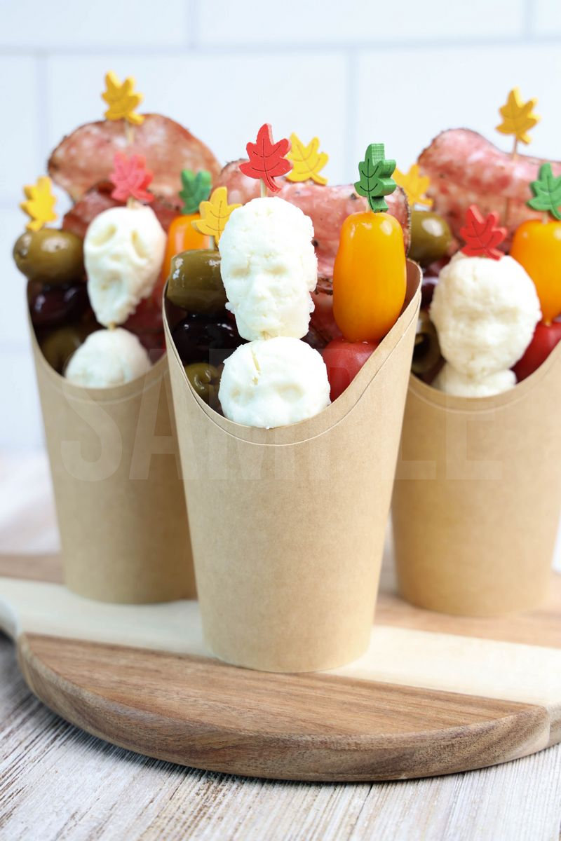 Horror Movie Charcuterie Cups is made with olives, peppered salami, heirloom tomatoes, and fresh mozzarella. This is a semi exclusive recipe. The Horror Movie Charcuterie Cups comes in a brown fry cup with rustic wood backdrop. Set comes with 9 in process (in process are the same for all sets) and 17 final shots (finals are different for each set) along with recipe in text format. Both vertical and horizontal shots are available for social media. One set of four. Sample removed on finals.