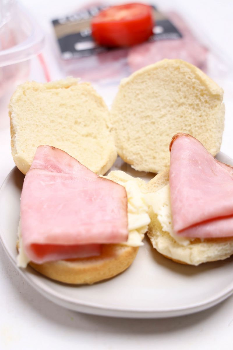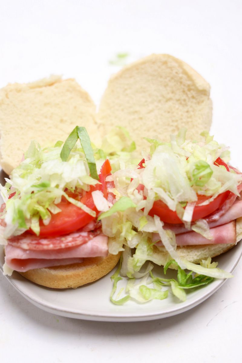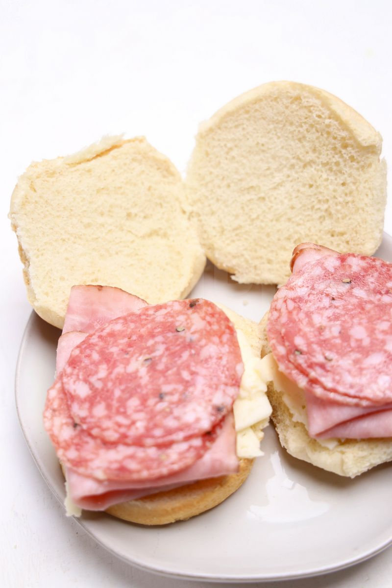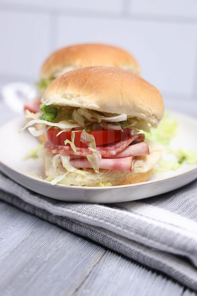 Italian Sliders is made with salami, ham, lettuce, tomato, and cheese. This is a semi exclusive recipe. The Italian Sliders comes on a white plate with a gray wood backdrop. Set comes with 12 in process (in process are the same for all sets) and 15 final shots (finals are different for each set) along with recipe in text format. Both vertical and horizontal shots are available for social media. One set of four. Sample removed on finals.