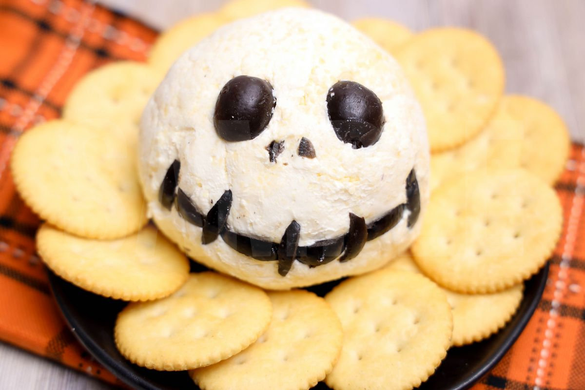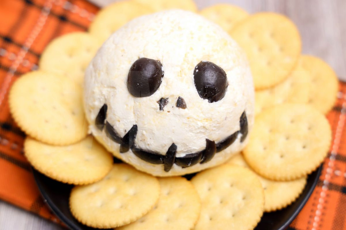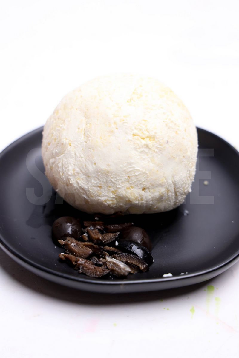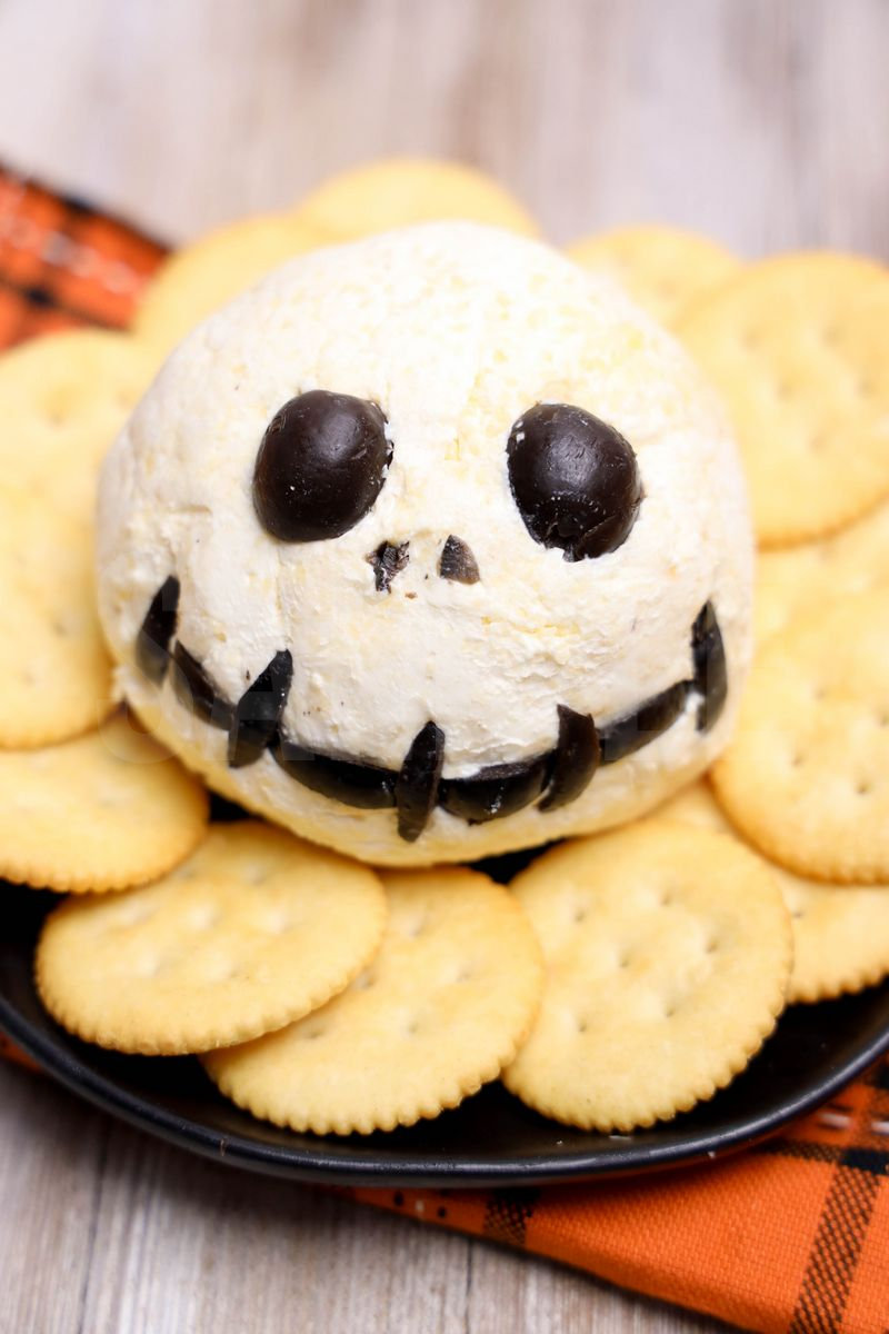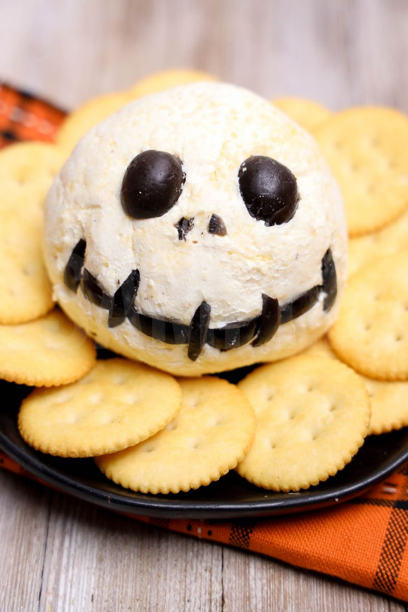 Jack Skellington Cheese Ball is made with  cream cheese, parmesan, and black olives. This is a semi exclusive recipe. The Jack Skellington Cheese Ball comes on a black plate with rustic wood backdrop. Set comes with 10 in process (in process are the same for all sets) and 16 final shots (finals are different for each set) along with recipe in text format. Both vertical and horizontal shots are available for social media. One set of four. Sample removed on finals.