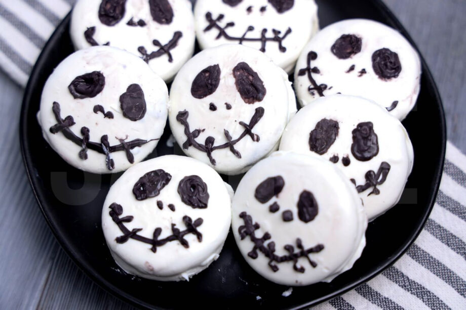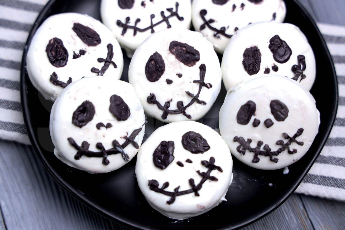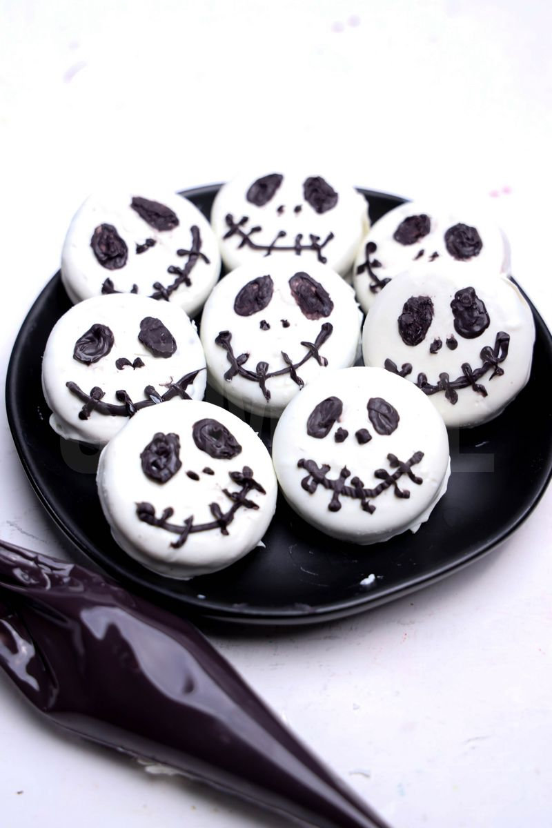 Jack Skellington Oreos is made with oreos, white candy melts, and black candy melts. This is a semi exclusive recipe. The Jack Skellington Oreos comes on a black plate with a gray wood backdrop. Set comes with 7 in process (in process are the same for all sets) and 16 final shots (finals are different for each set) along with recipe in text format. Both vertical and horizontal shots are available for social media. One set of four. Sample removed on finals.