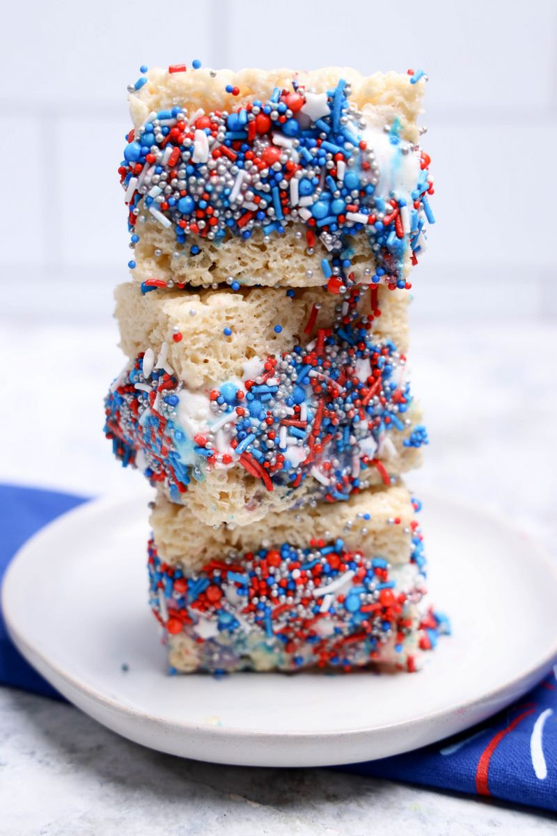 July 4th Rice Krispies Ice Cream Sandwiches is made with rice krispies treats, vanilla ice cream, and patriotic sprinkles. This is a semi exclusive recipe. The July 4th Rice Krispies Ice Cream Sandwiches comes in a white plate with marble wood backdrop. Set comes with 14 in process (in process are the same for all sets) and 15 final shots (finals are different for each set) along with recipe in text format. Both vertical and horizontal shots are available for social media. One set of four. Sample removed on finals.