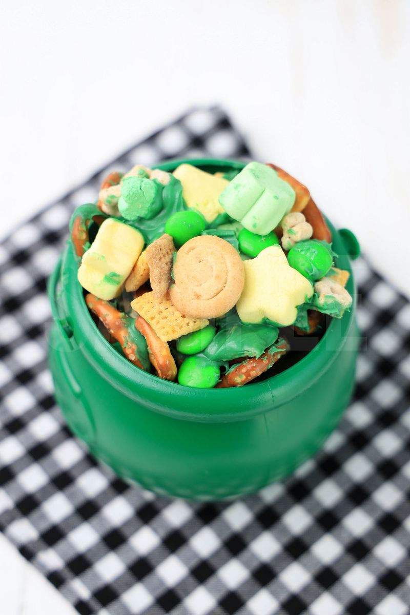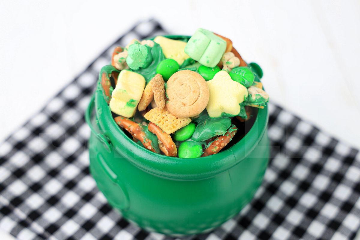 Leprechaun Bait is made with honey nut Chex mix, green M&M’s, and green candy melts . This is a semi exclusive recipe. The Leprechaun Bait comes in a green cauldron with a plaid napkin on a white wood backdrop. Set comes with 11 in process (in process are the same for all sets) and 20 final shots (finals are different for each set) along with recipe in text format. Both vertical and horizontal shots are available for social media. One set of four. Sample removed on finals.