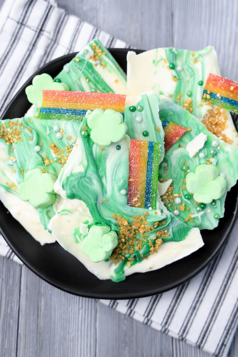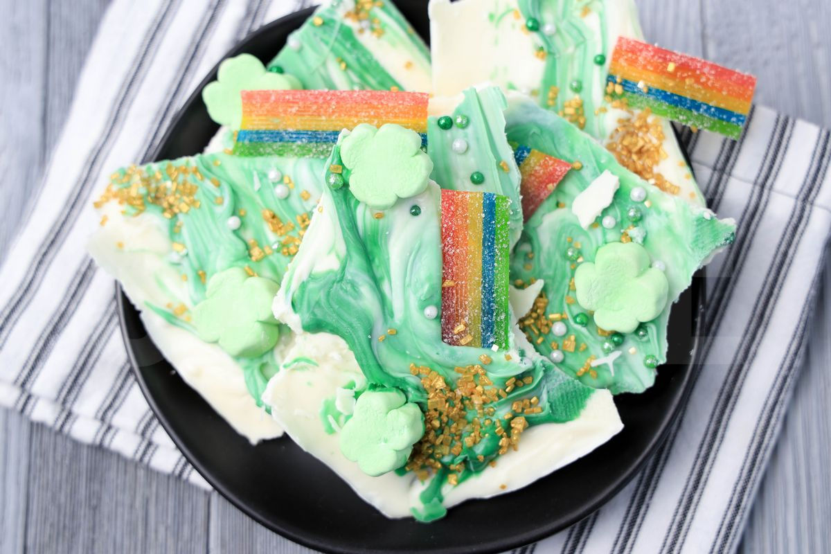 Leprechaun Bark is made with white chocolate, green candy melts, and rainbow airheads. This is a semi exclusive recipe. The Leprechaun Bark comes on a black plate with a white striped napkin on a gray wood backdrop. Set comes with 10 in process in the slow cooker (in process are the same for all sets) and 16 final shots (finals are different for each set) along with recipe in text format. Both vertical and horizontal shots are available for social media. One set of four. Sample removed on finals.