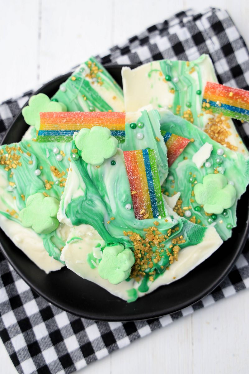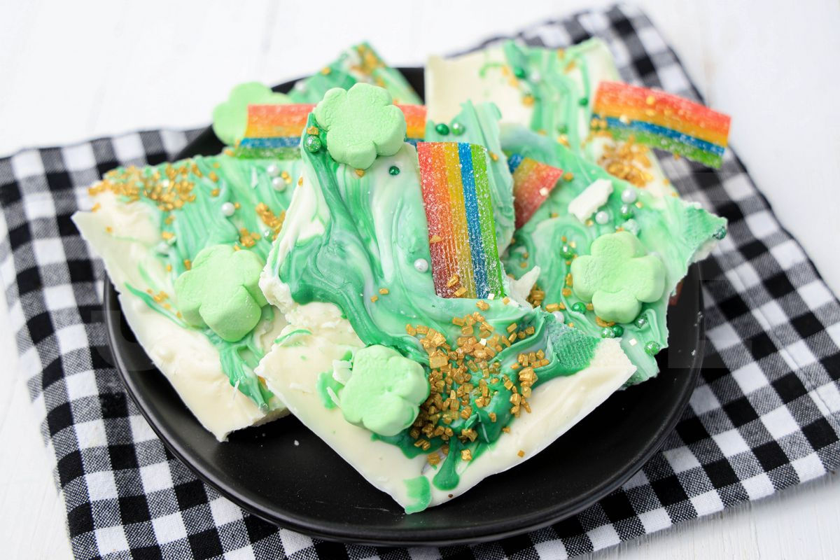 Leprechaun Bark is made with white chocolate, green candy melts, and rainbow airheads. This is a semi exclusive recipe. The Leprechaun Bark comes on a black plate with a plaid napkin on a white wood backdrop. Set comes with 10 in process in the slow cooker (in process are the same for all sets) and 16 final shots (finals are different for each set) along with recipe in text format. Both vertical and horizontal shots are available for social media. One set of four. Sample removed on finals.