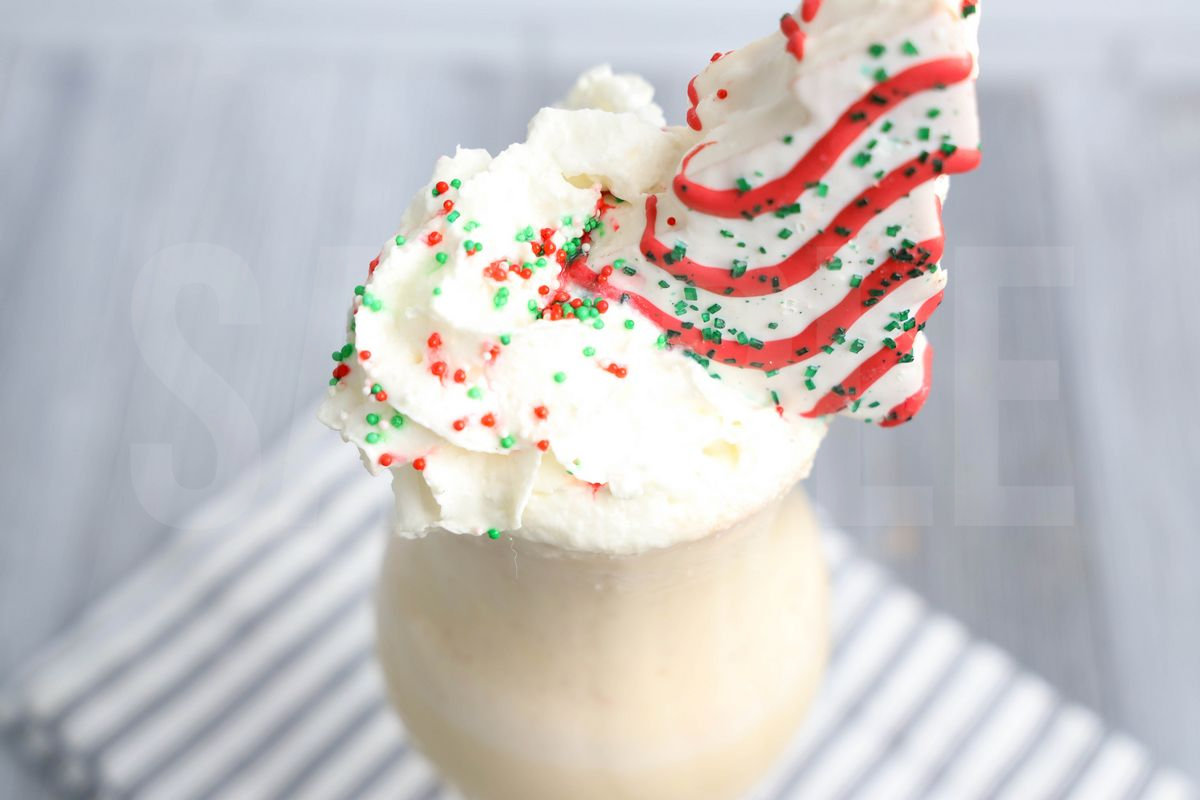 Little Debbie’s Christmas Tree Shake is made with ice cream, Little Debbie’s Christmas tree snacks, and whipped topping. This is a semi exclusive recipe. The Little Debbie’s Christmas Tree Shake comes in a clear glass with a white striped napkin on a gray wood backdrop. Set comes with 7 in process (in process are the same for all sets) and 16 final shots (finals are different for each set) along with recipe in text format. Both vertical and horizontal shots are available for social media. One set of four. Sample removed on finals.
