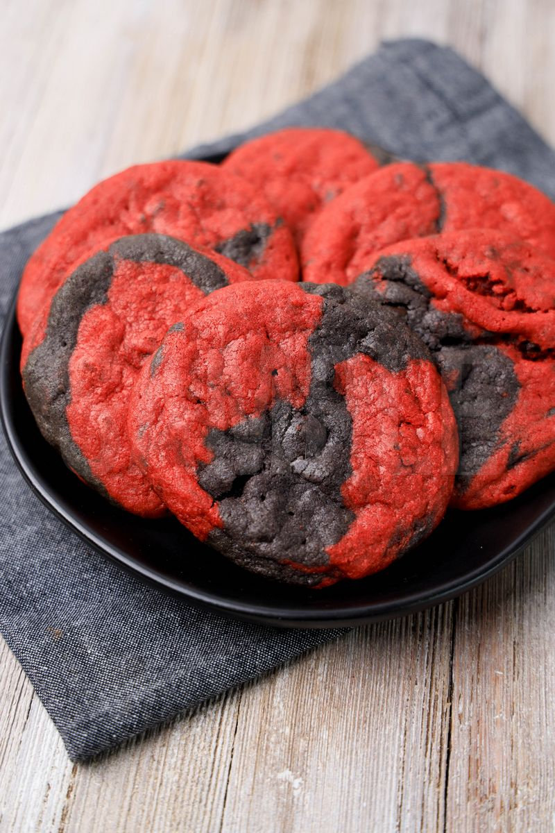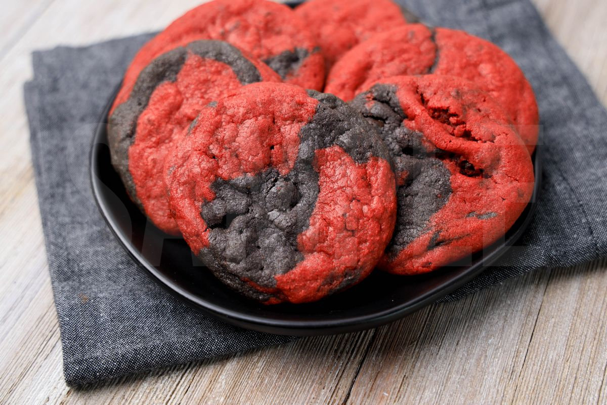 Lydia Beetlejuice Chocolate Chip Cookies is made with pre-made chocolate chip cookie dough, red food gel, and black food gel. This is a semi exclusive recipe. The Lydia Beetlejuice Chocolate Chip Cookies comes a denim napkin on a rustic wood backdrop. Set comes with 10 in process (in process are the same for all sets) and 18 final shots (finals are different for each set) along with recipe in text format. Both vertical and horizontal shots are available for social media. One set of four. Sample removed on finals.