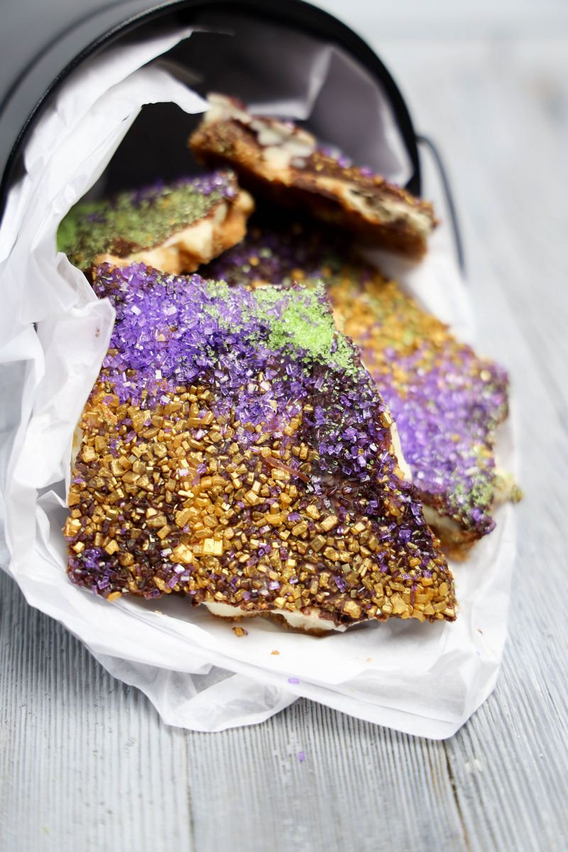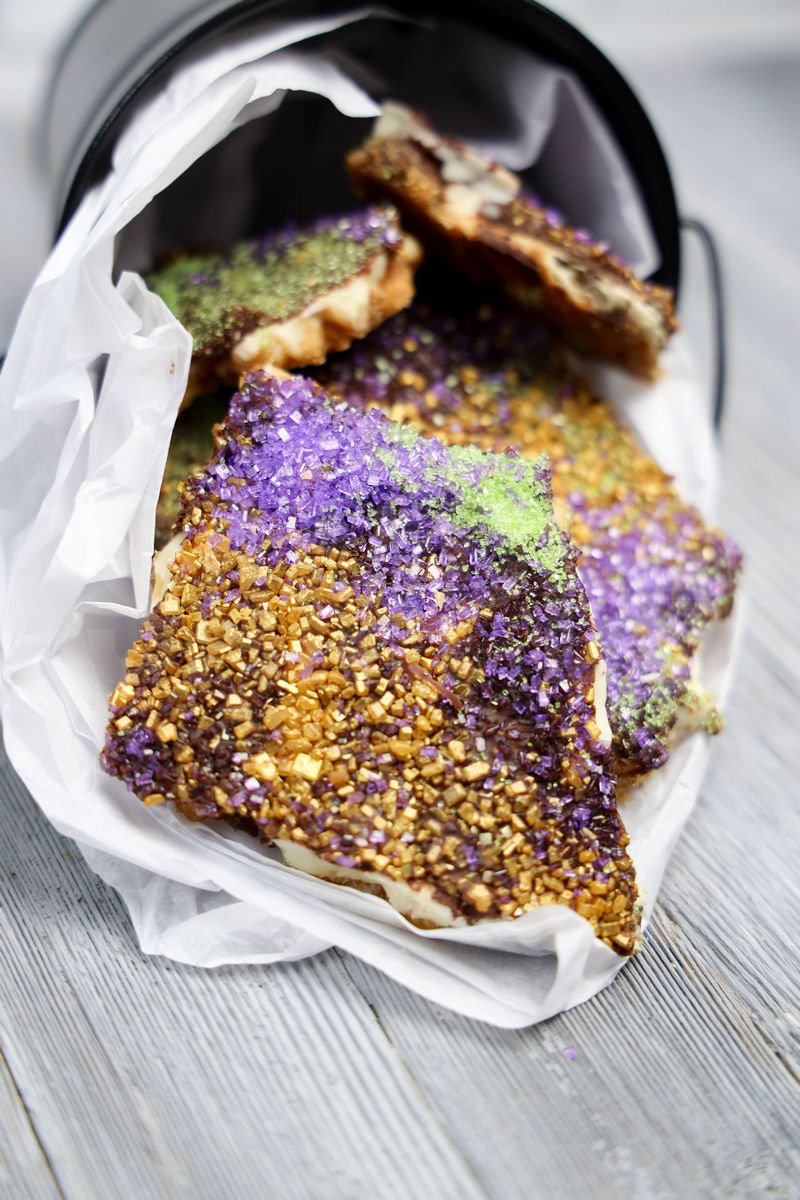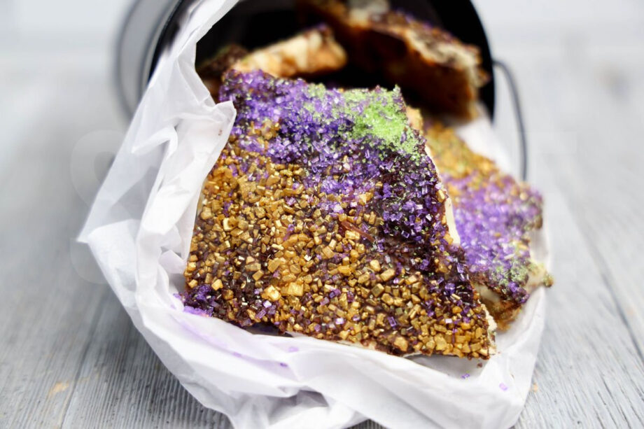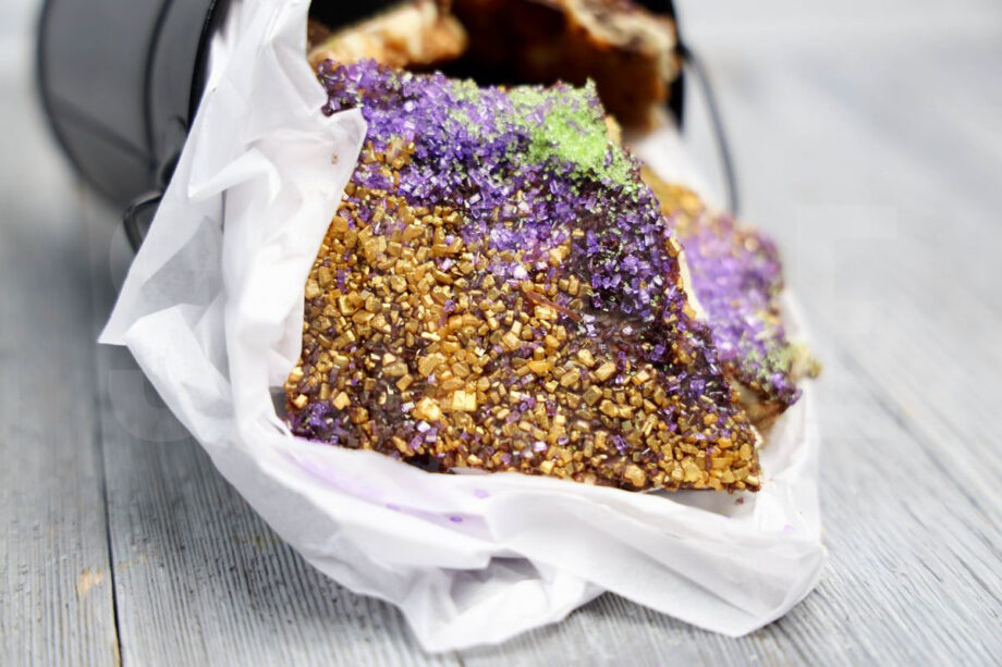 Mardi Gras Cracker Candy is made with Ghirardelli’s white chocolate and dark chocolate, saltine crackers, butter, dark brown sugar, and sanding sugar. This is a semi exclusive recipe. The Mardi Gras Cracker Candy comes in a black pail on a gray wood backdrop. Set comes with 14 in process (in process are the same for all sets) and 20 final shots (finals are different for each set) along with recipe in text format. Both vertical and horizontal shots are available for social media. One set of four. Sample removed on finals.