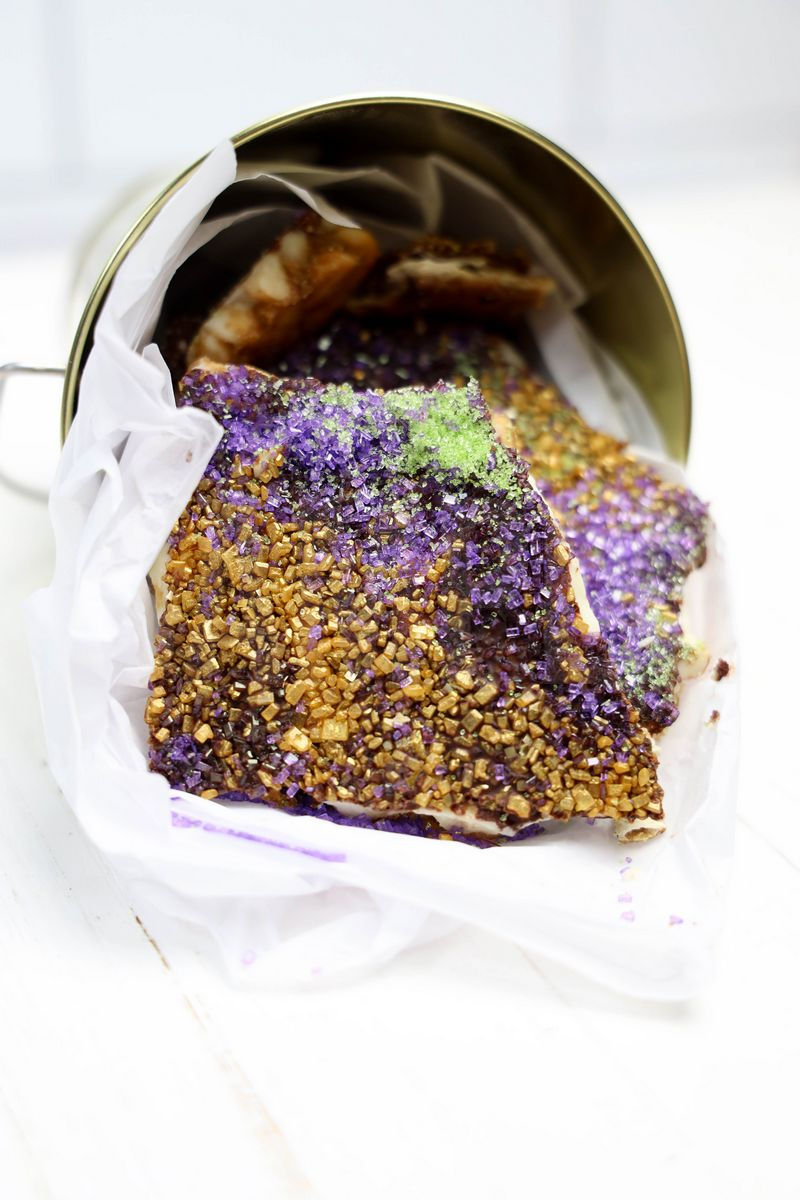 Mardi Gras Cracker Candy is made with Ghirardelli’s white chocolate and dark chocolate, saltine crackers, butter, dark brown sugar, and sanding sugar. This is a semi exclusive recipe. The Mardi Gras Cracker Candy comes in a gold pail on a white wood backdrop. Set comes with 14 in process (in process are the same for all sets) and 18 final shots (finals are different for each set) along with recipe in text format. Both vertical and horizontal shots are available for social media. One set of four. Sample removed on finals.