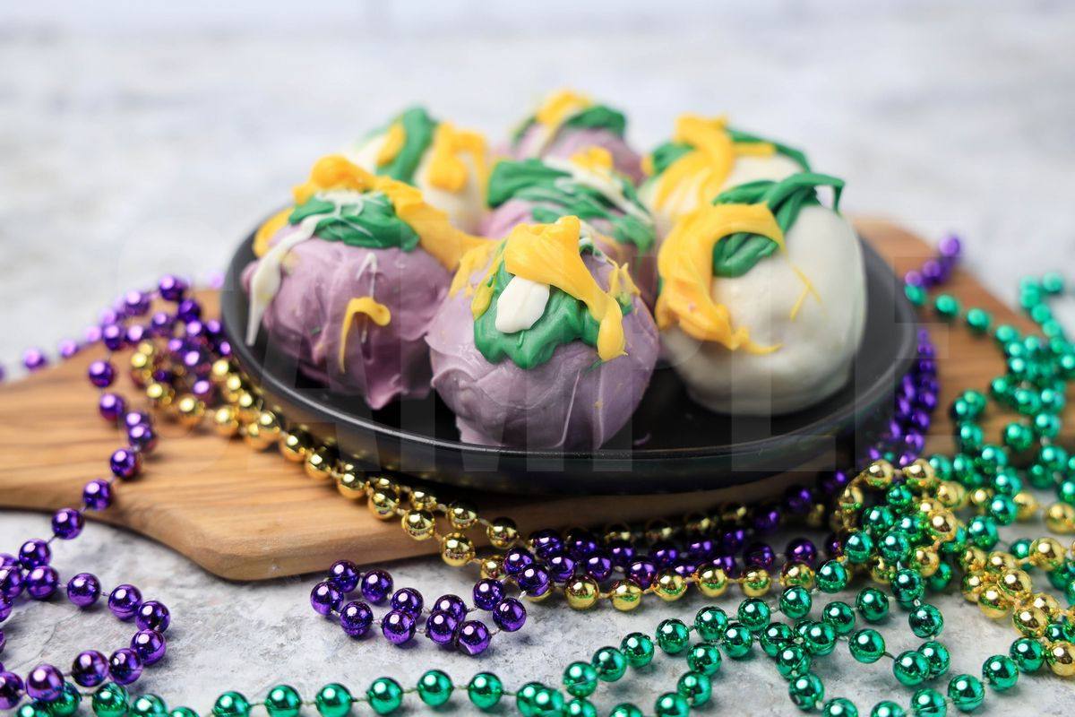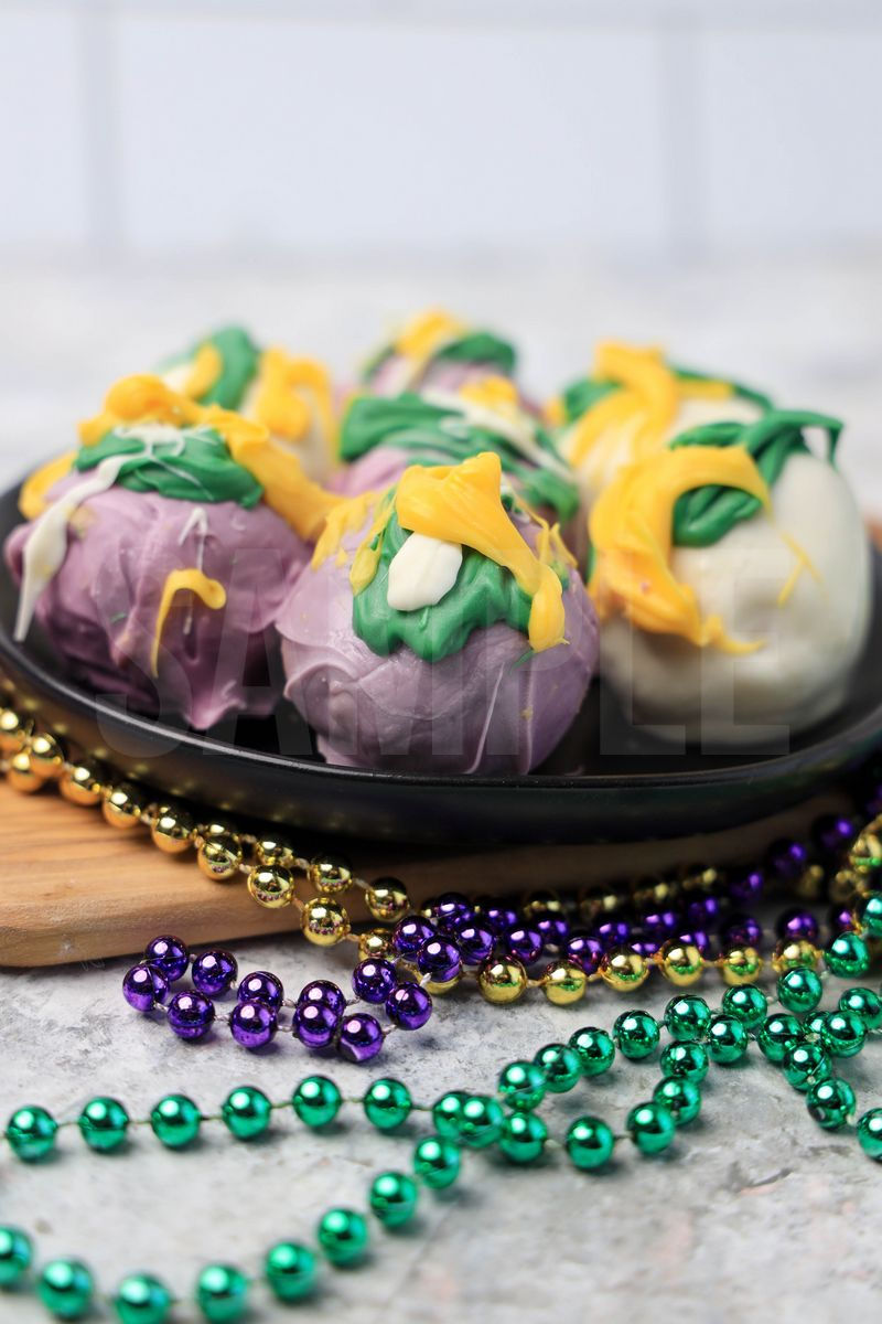 Mardi Gras Oreo Balls is made with golden oreos, purple, yellow, white, and green candy melts. This is a semi exclusive recipe. The Mardi Gras Oreo Balls comes on a black plate on a olive wood cutting board on a marble backdrop. Set comes with 19 in process (in process are the same for all sets) and 16 final shots (finals are different for each set) along with recipe in text format. Both vertical and horizontal shots are available for social media. One set of four. Sample removed on finals.