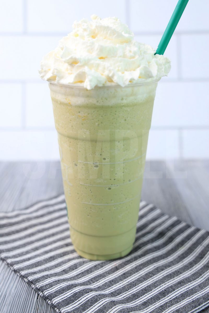 Matcha Crème Frappuccino is made with matcha green tea concentrate, heavy cream, and ice. This is a semi exclusive recipe. The Matcha Crème Frappuccino comes in a venti cup with a gray striped napkin on a gray wood backdrop. Set comes with 10 in process (in process are the same for all sets) and 15 final shots (finals are different for each set) along with recipe in text format. Both vertical and horizontal shots are available for social media. One set of four. Sample removed on finals.