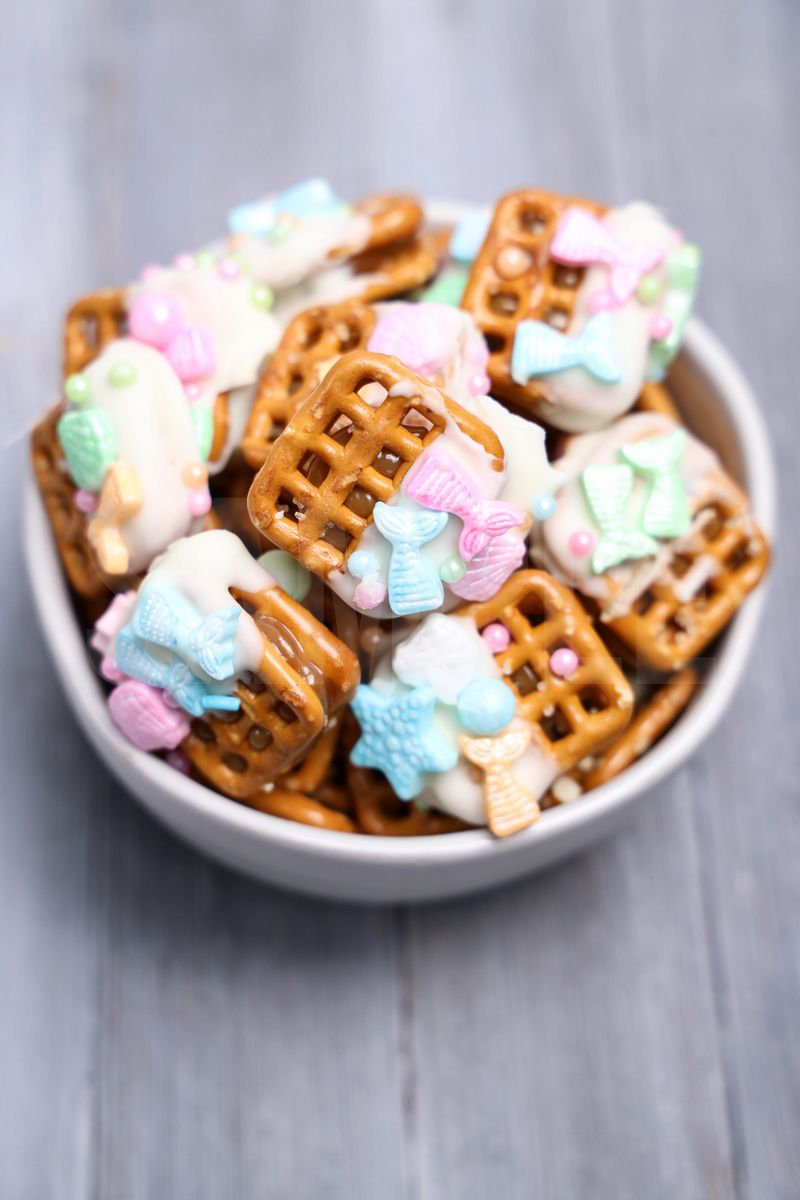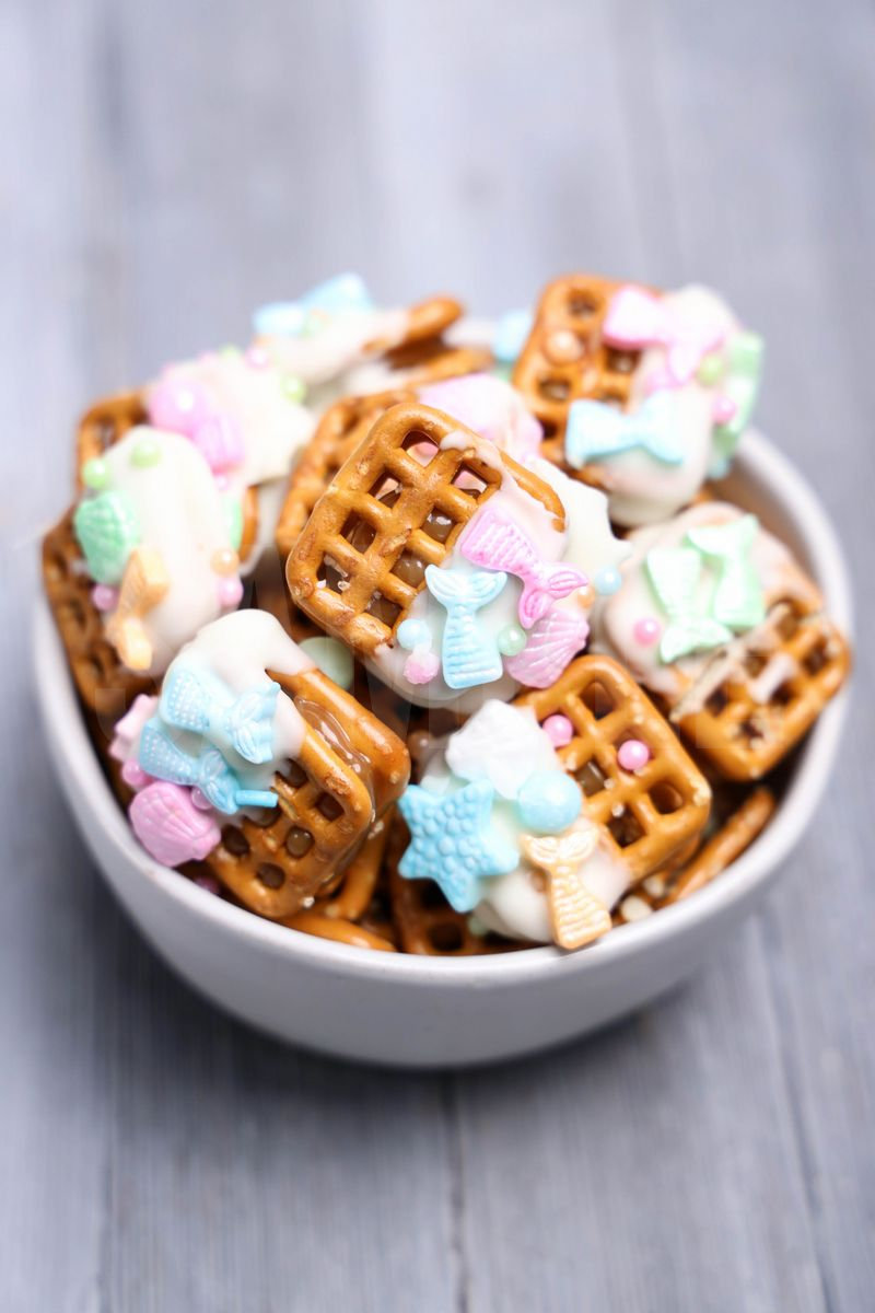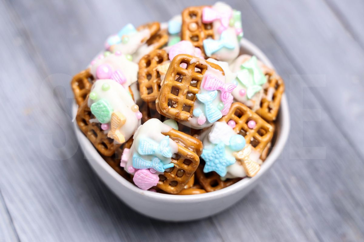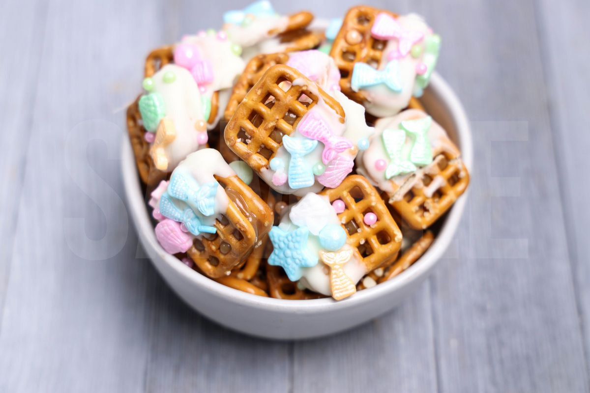 Mermaid Caramel Pretzels is made with mermaid sprinkles, white candy melts, sea salt caramel, and snaps pretzels. This is a semi exclusive recipe. The Mermaid Caramel Pretzels comes in a white bowl with gray wood backdrop. Set comes with 11 in process (in process are the same for all sets) and 14 final shots (finals are different for each set) along with recipe in text format. Both vertical and horizontal shots are available for social media. One set of four. Sample removed on finals.