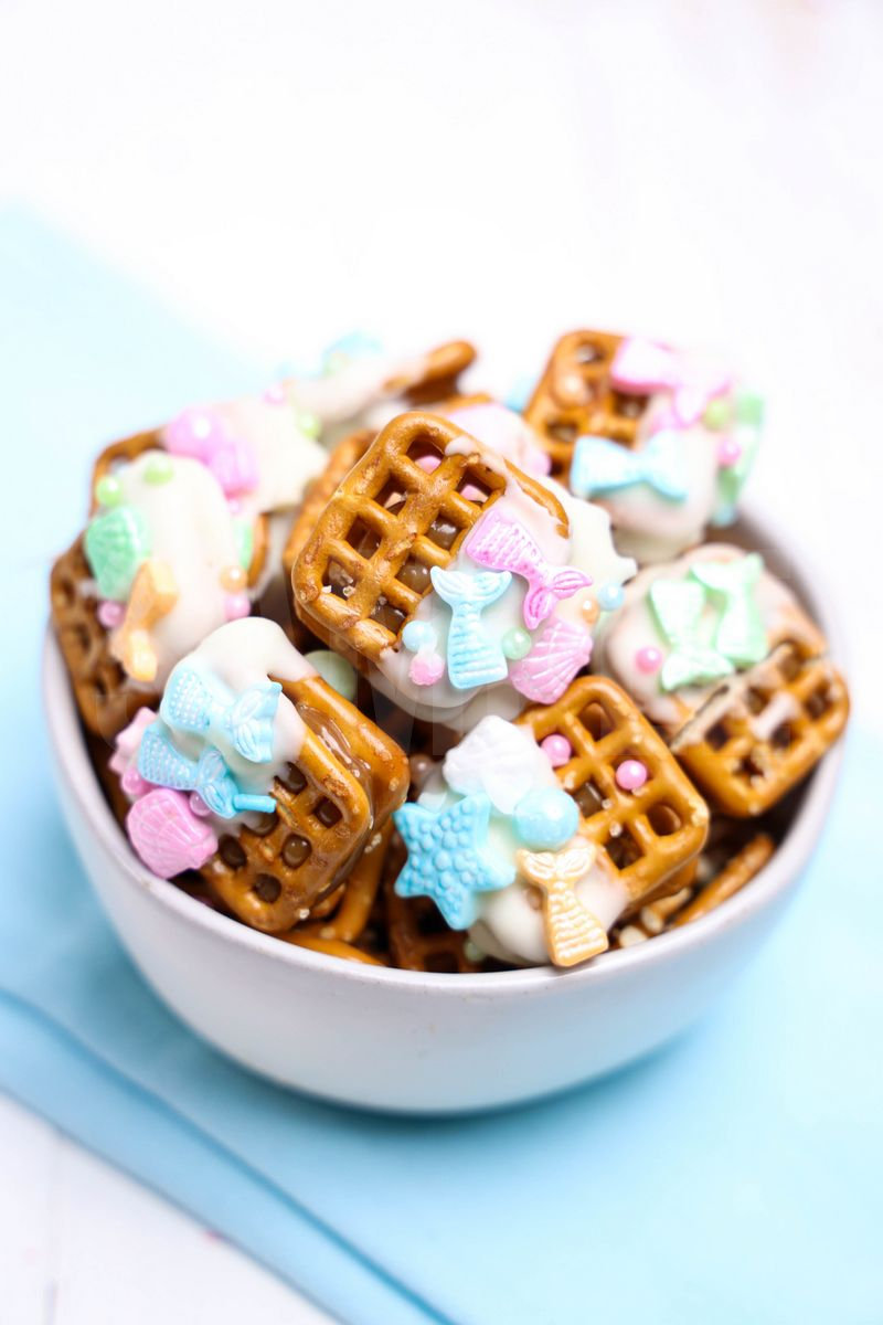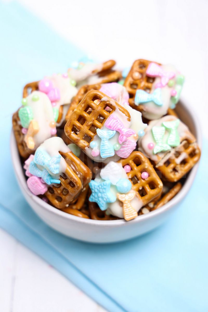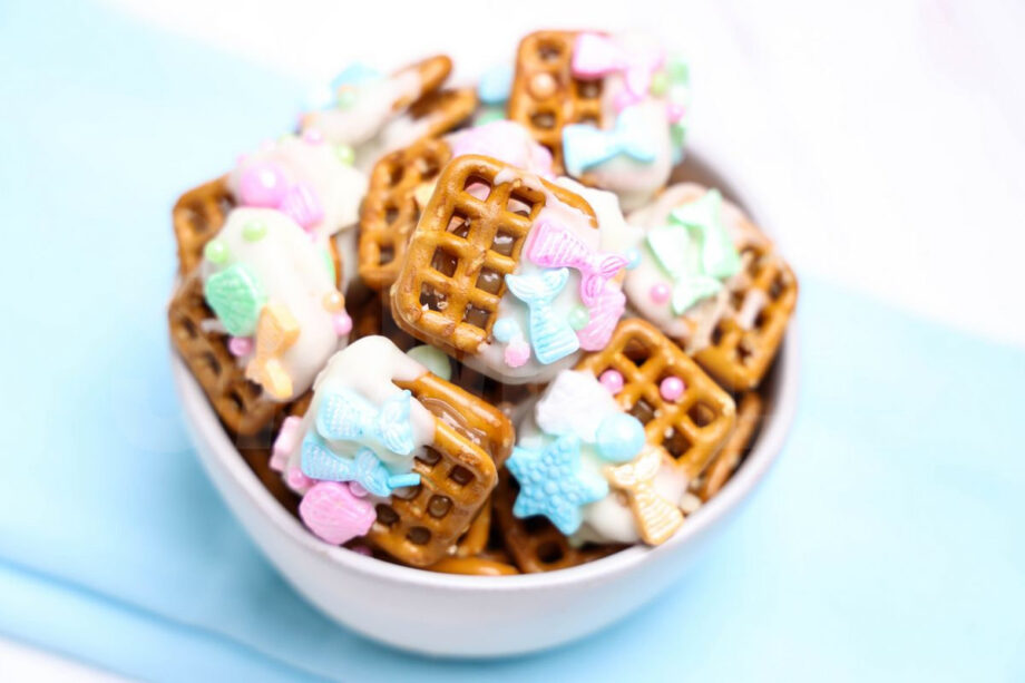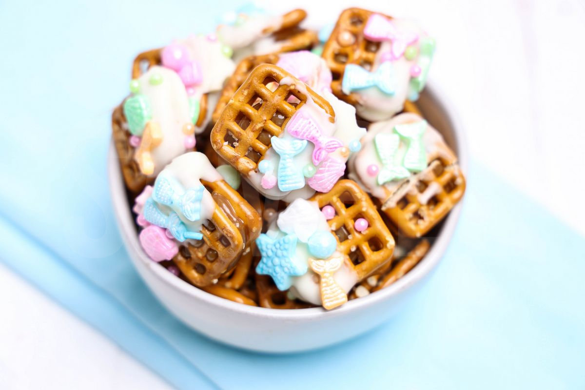 Mermaid Caramel Pretzels is made with mermaid sprinkles, white candy melts, sea salt caramel, and snaps pretzels. This is a semi exclusive recipe. The Mermaid Caramel Pretzels comes in a white bowl with white wood backdrop. Set comes with 11 in process (in process are the same for all sets) and 15 final shots (finals are different for each set) along with recipe in text format. Both vertical and horizontal shots are available for social media. One set of four. Sample removed on finals.