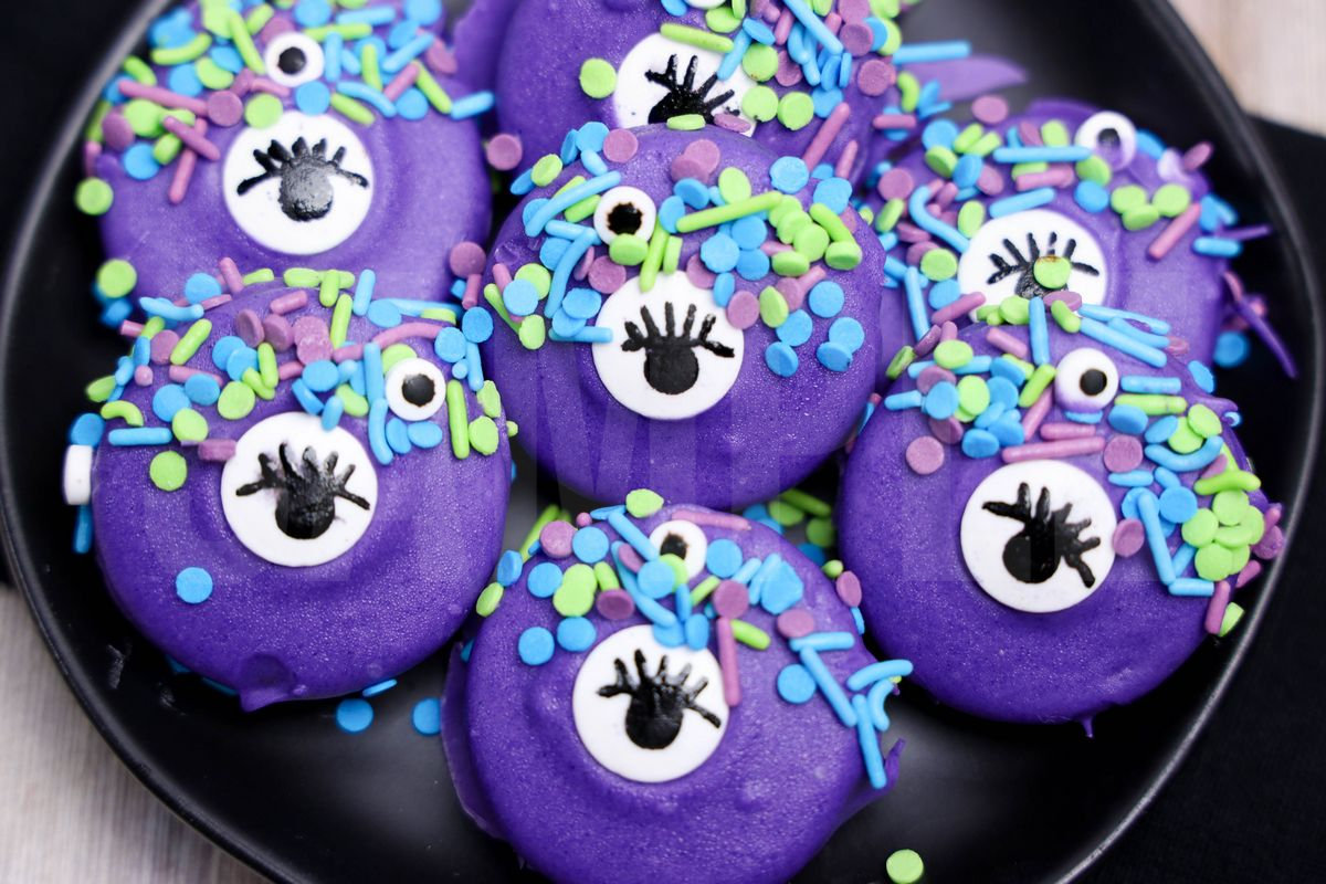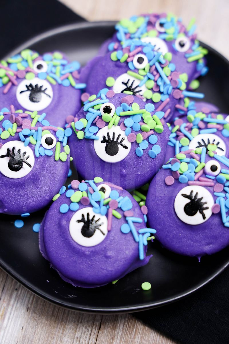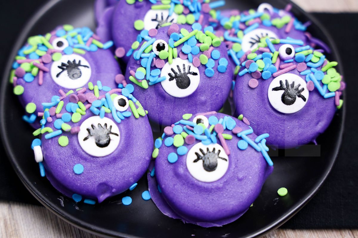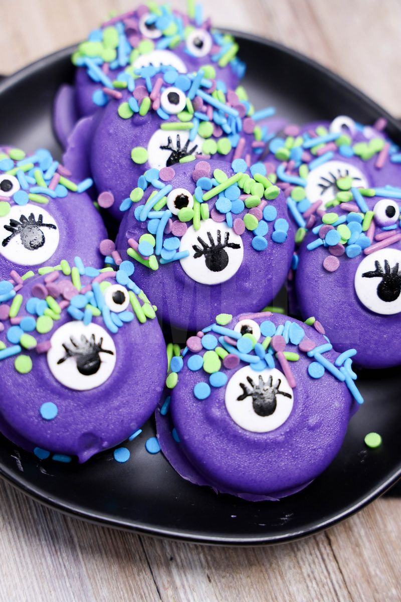 Monster Oreos is made with oreos, candy melts, and sprinkles. This is a semi exclusive recipe. The Monster Oreos comes on a black plate with rustic wood backdrop. Set comes with 9 in process (in process are the same for all sets) and 16 final shots (finals are different for each set) along with recipe in text format. Both vertical and horizontal shots are available for social media. One set of four. Sample removed on finals.