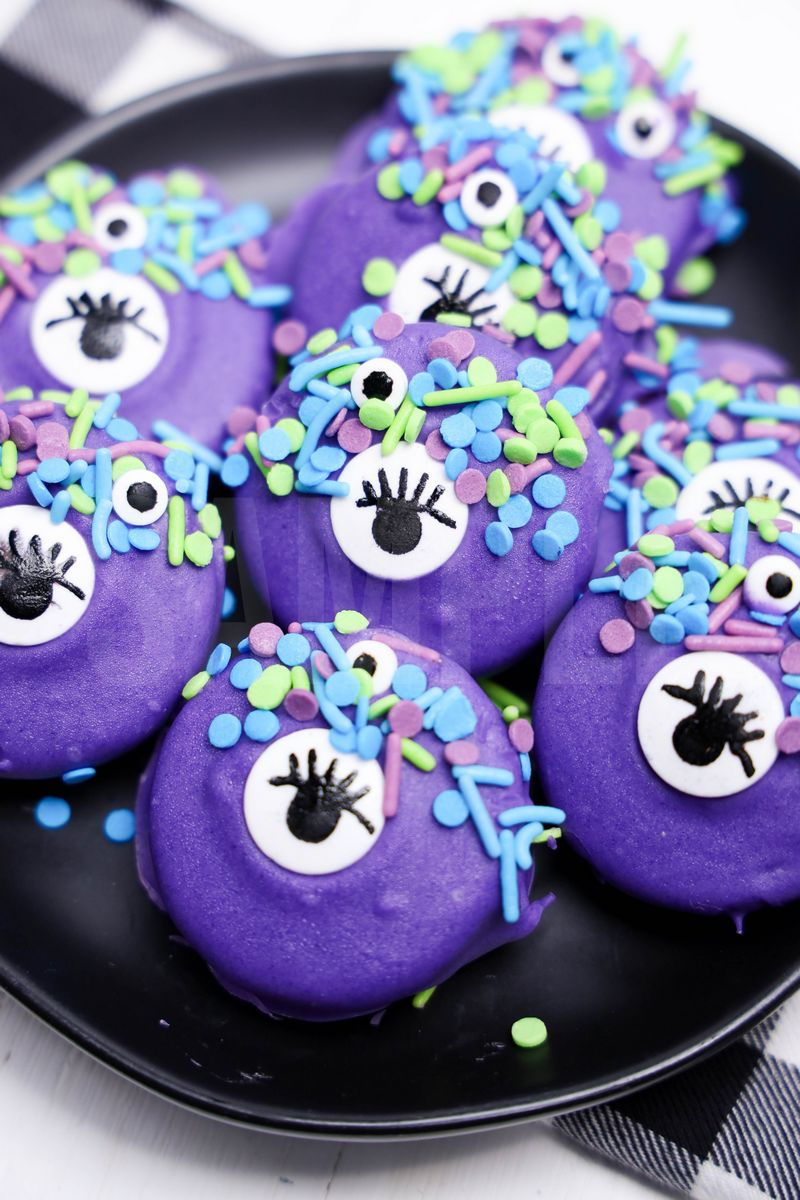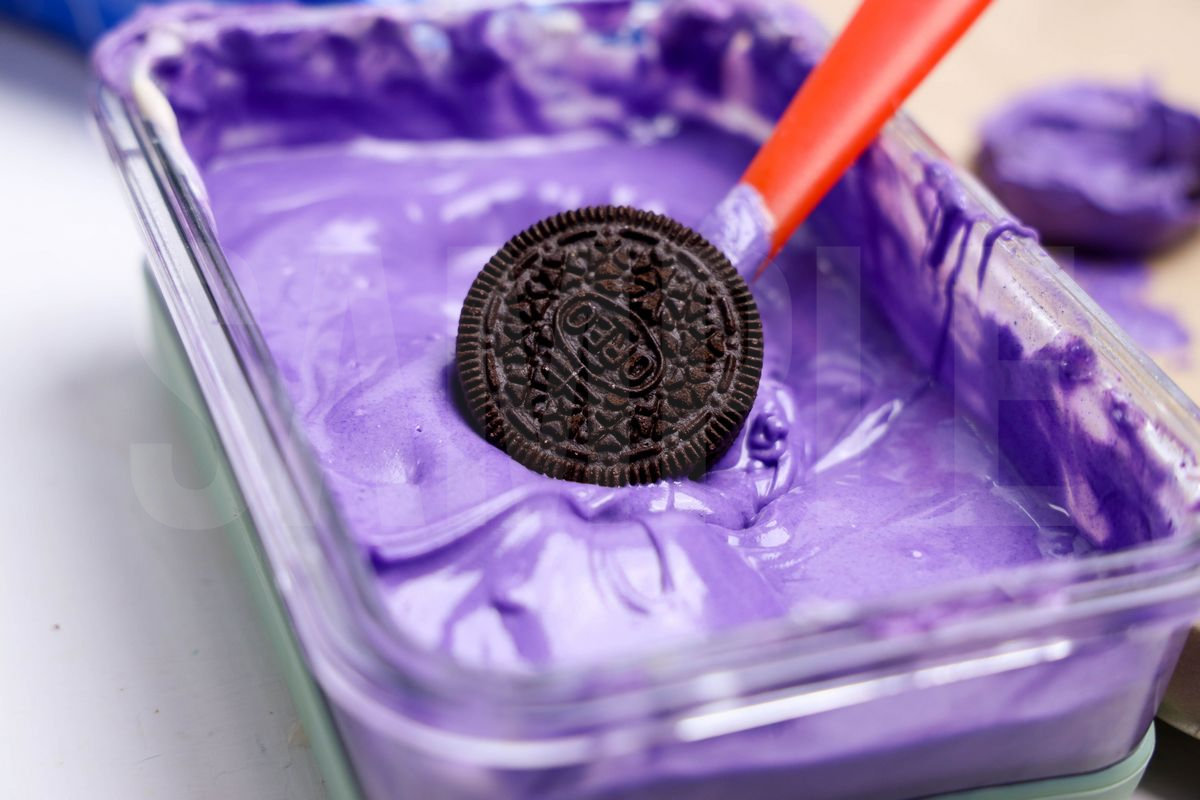 Monster Oreos is made with oreos, candy melts, and sprinkles. This is a semi exclusive recipe. The Monster Oreos comes on a black plate with white wood backdrop. Set comes with 9 in process (in process are the same for all sets) and 17 final shots (finals are different for each set) along with recipe in text format. Both vertical and horizontal shots are available for social media. One set of four. Sample removed on finals.